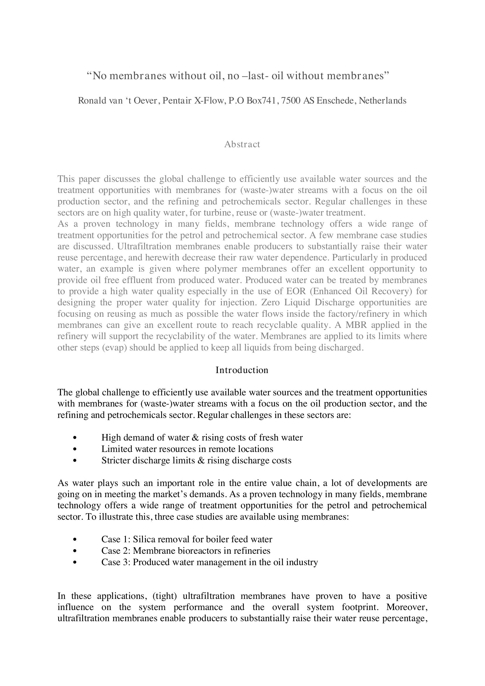 | Keywords | UF Membranes, Ehanced Oil Recovery, Zero Liquid Discharge |