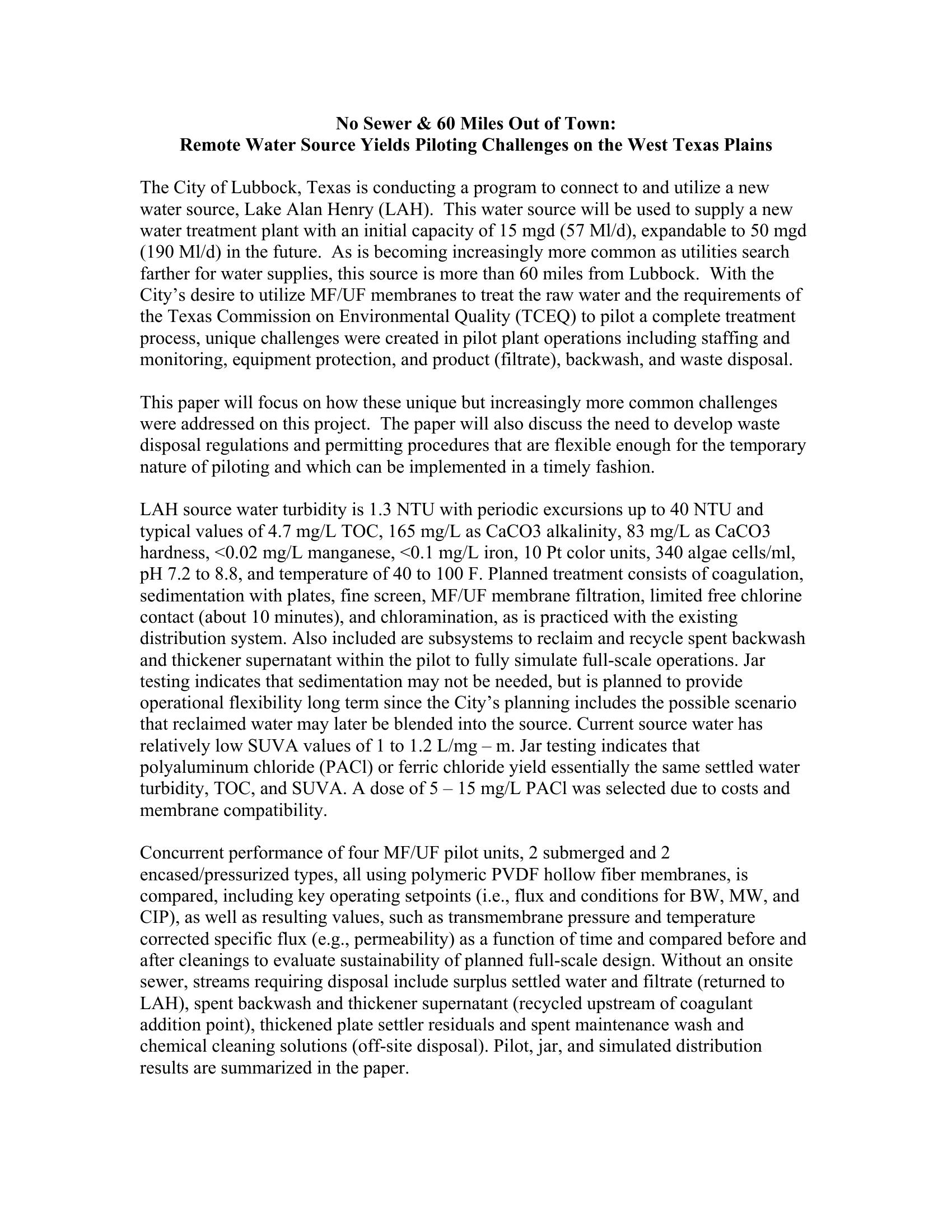 The City of Lubbock, Texas is conducting a program to connect to and utilize a new water source, Lake Alan Henry (LAH). This water source will be used to supply a new