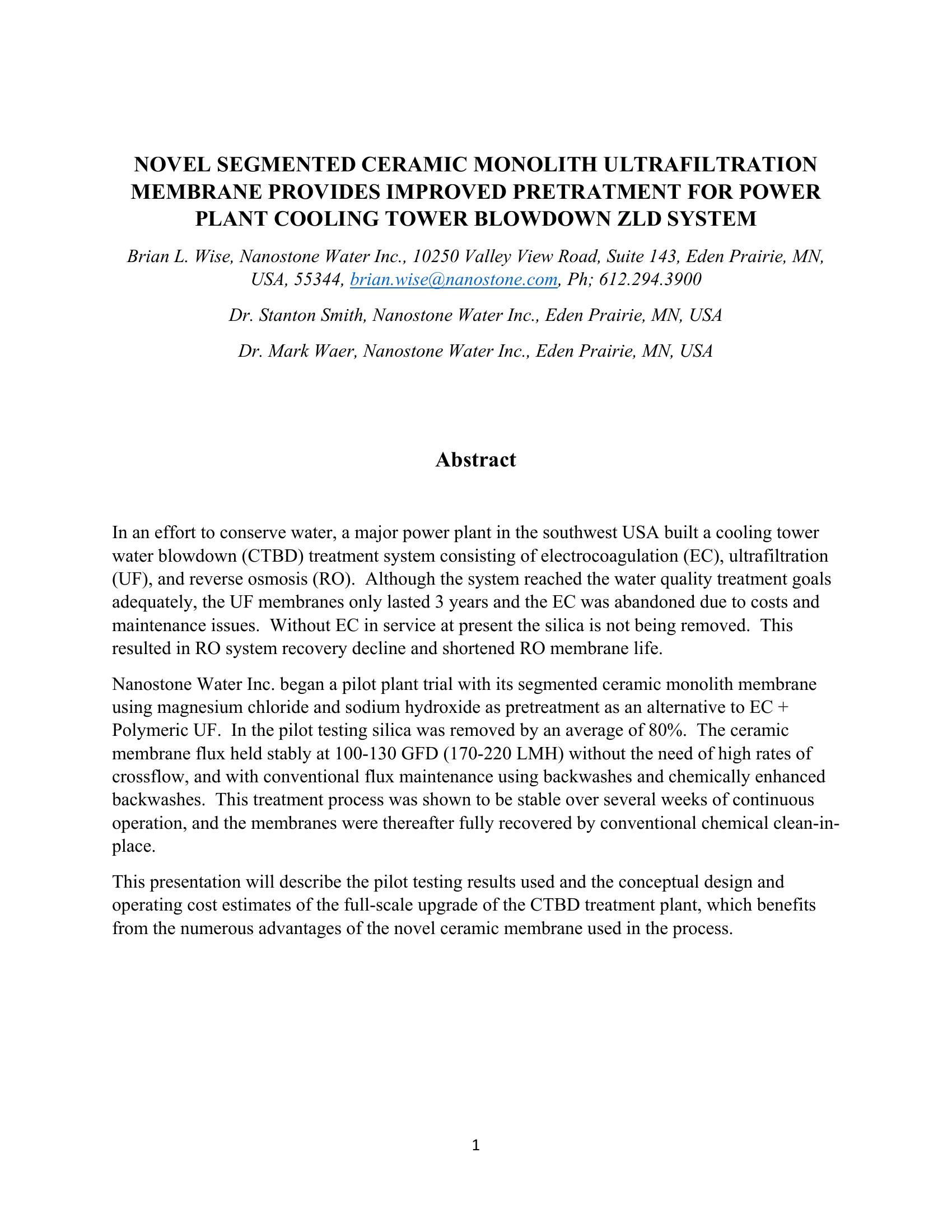 Novel Segmented Ceramic Monolith Ultrafiltration Membrane Provides Improved Pre-Treatment For Power Plant Cooling Tower Blowdown ZLD System