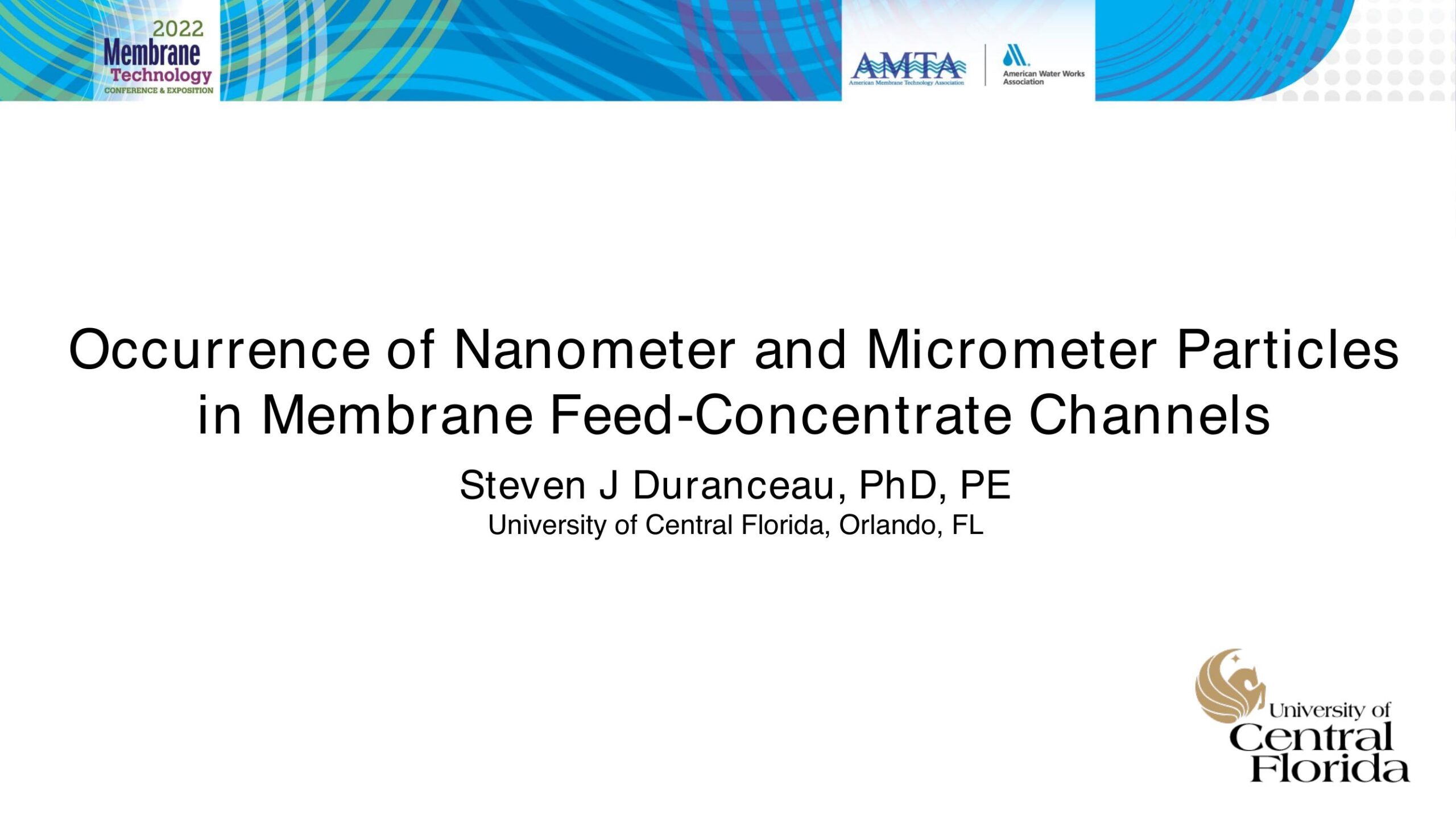 An investigation into the occurrence of nanometer and micrometer range particles in the feedconcentrate channels of operating, production capacity reverse osmosis (RO) and nanofiltration (NF) membrane process was performed. Samples of the feed, permeate and concentrate bulk streams were sampled and submitted for particle analysis. Particle distributions using nanoparticle tracking analysis (NTA) and single particle optical sensing (SPOS) technologies were employed to evaluate the size (average diameter) and concentration of particulates in membrane process feed-concentrate channels. The ability to access commercially available nano-range analytical particle sensing equipment has expanded in recent years, such as nanoparticle tracking analysis (NTA) and single particle optical sensing (SPOS). NTA was first used to initially screen the range of particles in the membrane feed-concentrate channel of a brackish RO facility, then in a follow-up action, both NTA and SPOS were used to evaluate the size and number of nano- and micro-scale particles in the feed concentrate channel of NF membrane process. ? NTA analysis revealed that particles ranging between 300 and 1,300 nanometers (nm) existed in the feed-concentrate RO channel stream that had been pretreated with sulfuric acid, scale inhibitor and 1- micron cartridge filtration. Particle sizes varied widely in the feedwater but averaged approximately 320-nm in the feedwater. However, particle sizes increased in the concentrate which was found to contain particles averaging around 535-nm. ? Unlike the brackish RO process, particles ranging between 50 nm and 70 micrometers (?m) were detected in the feed-concentrate channel of the NF membrane process evaluated. The NF process treated surficial groundwater and employed pretreatment consisting of sulfuric acid, scale inhibitor addition and nominal 5-micron cartridge filtration. Most of the particles identified in the NF feedconcentrate channel had an average diameter of less than 1-?m. Submicron particle content averaged 64 million particles per milliliter (mL), 47 million particles/mL, and 3.5 million particles/mL in the feed, interstage and concentrate streams, respectively. The concentration of particles less than 500-nm exceeded those greater than 500-nm by at least one order of magnitude. However, the less abundant microparticles occupied more of the volume within the feed-concentrate channel than the more concentrated submicron particles. ? Additional note: A companion study that analyzed matter captured after filtering 20-liters of the NF feed, interstage and concentrate streams on 0.2-micron rated silver 47-mm diameter filter pads by energy-dispersive x-ray spectroscopy revealed deposits of calcium carbonate, elemental sulfur, and silts/clays in each stream; however, deposits of organic-based matter were mainly identified in the interstage and concentrate streams (source: Powell & Duranceau, 2021).
