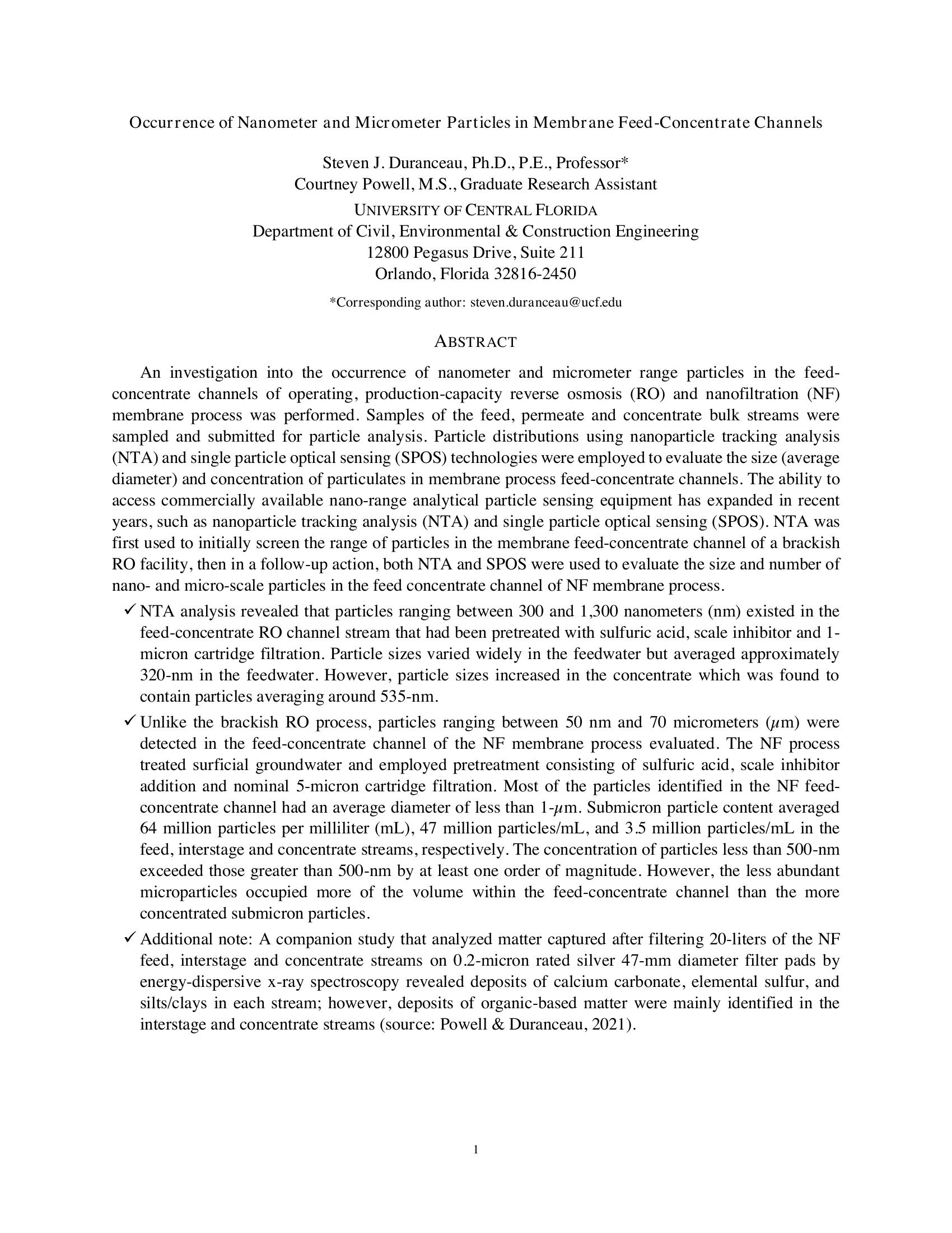 An investigation into the occurrence of nanometer and micrometer range particles in the feedconcentrate channels of operating, production capacity reverse osmosis (RO) and nanofiltration (NF) membrane process was performed. Samples of the feed, permeate and concentrate bulk streams were sampled and submitted for particle analysis. Particle distributions using nanoparticle tracking analysis (NTA) and single particle optical sensing (SPOS) technologies were employed to evaluate the size (average diameter) and concentration of particulates in membrane process feed-concentrate channels. The ability to access commercially available nano-range analytical particle sensing equipment has expanded in recent years, such as nanoparticle tracking analysis (NTA) and single particle optical sensing (SPOS). NTA was first used to initially screen the range of particles in the membrane feed-concentrate channel of a brackish RO facility, then in a follow-up action, both NTA and SPOS were used to evaluate the size and number of nano- and micro-scale particles in the feed concentrate channel of NF membrane process. ? NTA analysis revealed that particles ranging between 300 and 1,300 nanometers (nm) existed in the feed-concentrate RO channel stream that had been pretreated with sulfuric acid, scale inhibitor and 1- micron cartridge filtration. Particle sizes varied widely in the feedwater but averaged approximately 320-nm in the feedwater. However, particle sizes increased in the concentrate which was found to contain particles averaging around 535-nm. ? Unlike the brackish RO process, particles ranging between 50 nm and 70 micrometers (?m) were detected in the feed-concentrate channel of the NF membrane process evaluated. The NF process treated surficial groundwater and employed pretreatment consisting of sulfuric acid, scale inhibitor addition and nominal 5-micron cartridge filtration. Most of the particles identified in the NF feedconcentrate channel had an average diameter of less than 1-?m. Submicron particle content averaged 64 million particles per milliliter (mL), 47 million particles/mL, and 3.5 million particles/mL in the feed, interstage and concentrate streams, respectively. The concentration of particles less than 500-nm exceeded those greater than 500-nm by at least one order of magnitude. However, the less abundant microparticles occupied more of the volume within the feed-concentrate channel than the more concentrated submicron particles. ? Additional note: A companion study that analyzed matter captured after filtering 20-liters of the NF feed, interstage and concentrate streams on 0.2-micron rated silver 47-mm diameter filter pads by energy-dispersive x-ray spectroscopy revealed deposits of calcium carbonate, elemental sulfur, and silts/clays in each stream; however, deposits of organic-based matter were mainly identified in the interstage and concentrate streams (source: Powell & Duranceau, 2021).
