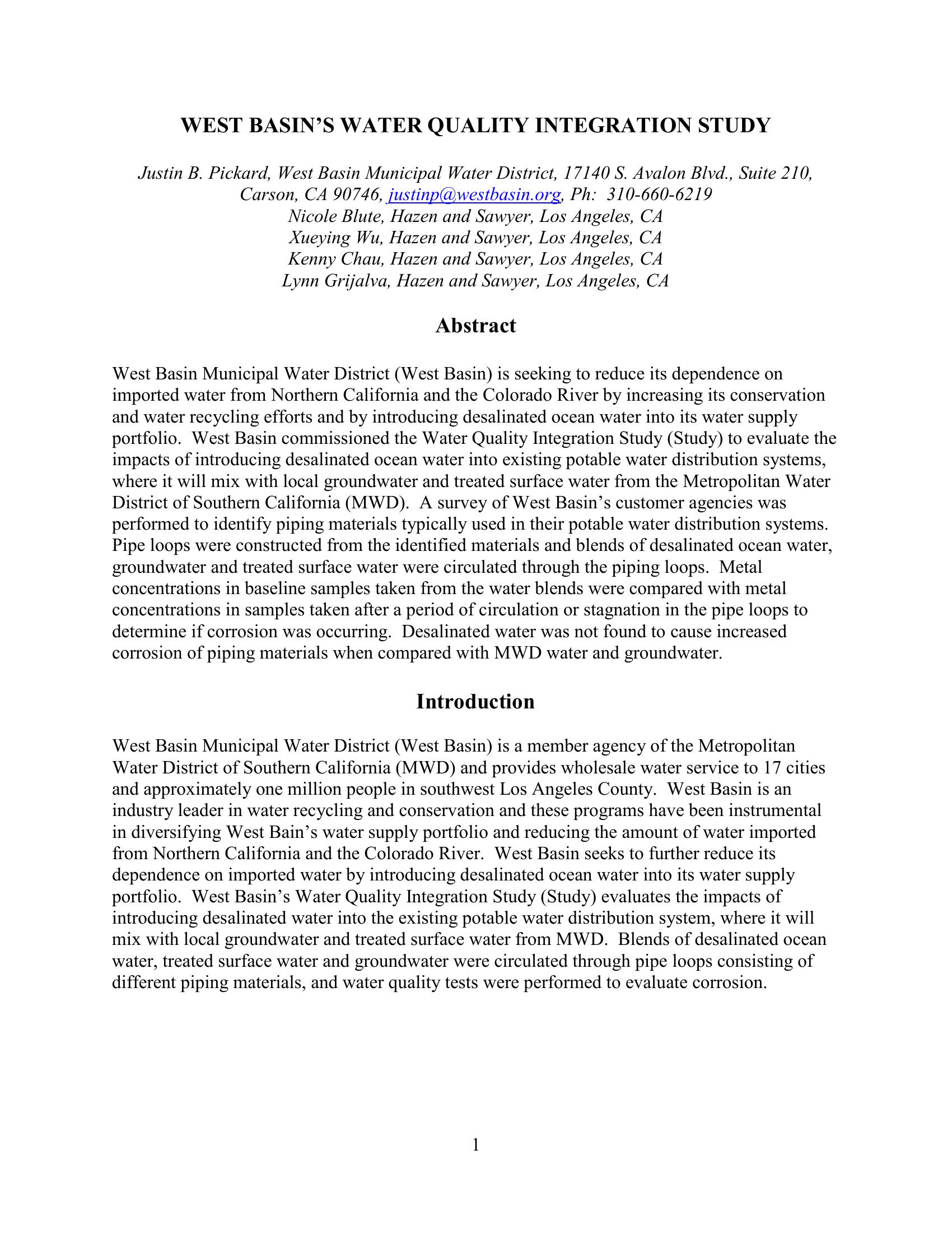 Prior to the introduction into a drinking water distribution system, desalinated water requires post-treatment that involves the addition of minerals back into the water to provide a water quality that is non-corrosive toward distribution system materials. Blends of desalinated ocean water, treated surface water and local groundwater were circulated through pipe loops to identify potential impacts to potable water distribution systems from the differing water qualities. The pipe loops were constucted to evaluate a range of materials typically found in potable water distribution systems and allowed for a direct comparison of different water qualities. Pipe loop testing involved post-treatment stabilization of desalinated ocean water to achieve water quality targets for alkalinity, pH, and calcium.