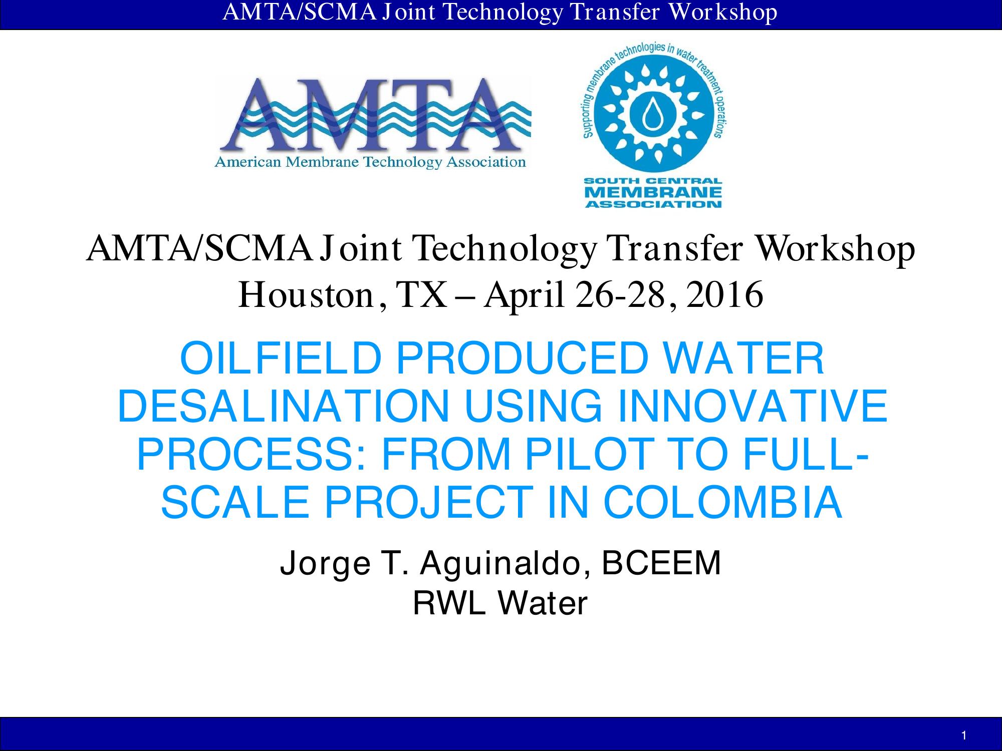 Produced water from oil field in Colombia, with capacity of 500,000 barrels/day (21 MGD) normally discharged as wastewater, is treated for irrigation water using innovative membrane treatment processes is decribed in this presentation. The same treatment can be employed in well fields in US to recover produced water for beneficial use.