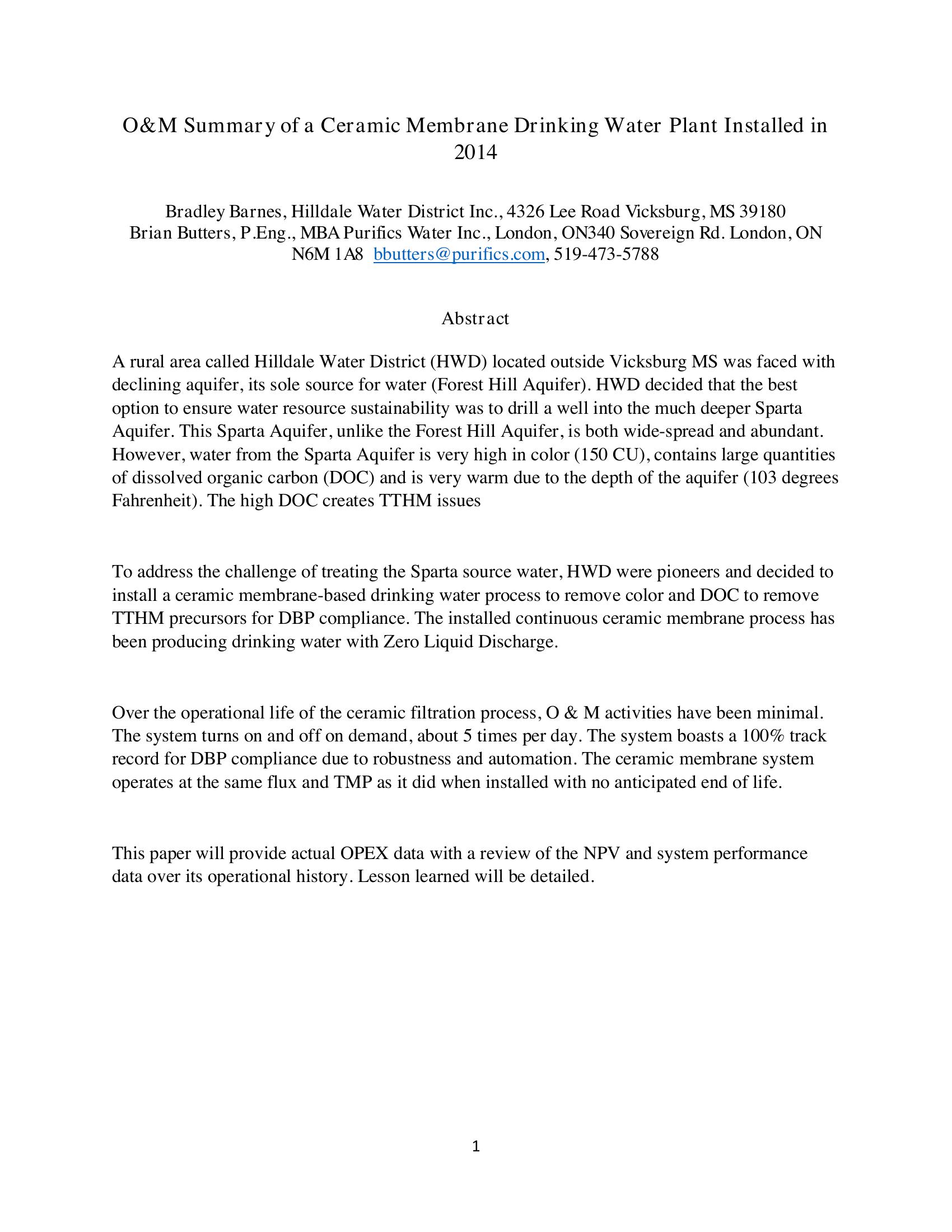 A rural area called Hilldale Water District (HWD) located outside Vicksburg MS was faced with declining aquifer, its sole source for water (Forest Hill Aquifer). HWD decided that the best option to ensure water resource sustainability was to drill a well into the much deeper Sparta Aquifer. This Sparta Aquifer, unlike the Forest Hill Aquifer, is both wide-spread and abundant. However, water from the Sparta Aquifer is very high in color (150 CU), contains large quantities of dissolved organic carbon (DOC) and is very warm due to the depth of the aquifer (103 degrees Fahrenheit). The high DOC creates TTHM issues To address the challenge of treating the Sparta source water, HWD were pioneers and decided to install a ceramic membrane-based drinking water process to remove color and DOC to remove TTHM precursors for DBP compliance. The installed continuous ceramic membrane process has been producing drinking water with Zero Liquid Discharge. Over the operational life of the ceramic filtration process, O & M activities have been minimal. The system turns on and off on demand, about 5 times per day. The system boasts a 100% track record for DBP compliance due to robustness and automation. The ceramic membrane system operates at the same flux and TMP as it did when installed with no anticipated end of life. This paper will provide actual OPEX data with a review of the NPV and system performance data over its operational history. Lesson learned will be detailed.