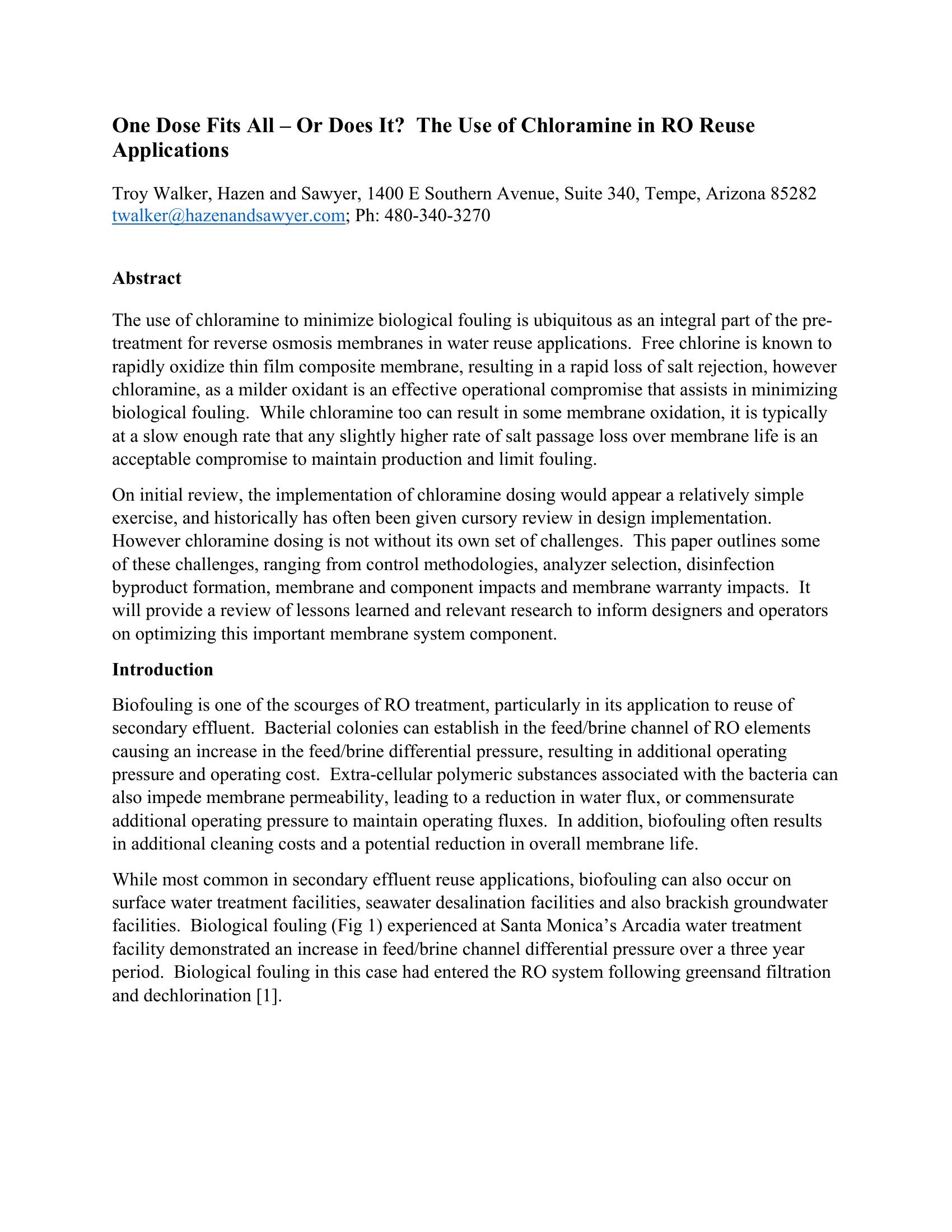This presentation will review the use of chloramine as a means of RO membrane fouling control in reuse applications and discuss the advantages and challenges of this approach. It will use case studies in reuse from the United States and around the world.