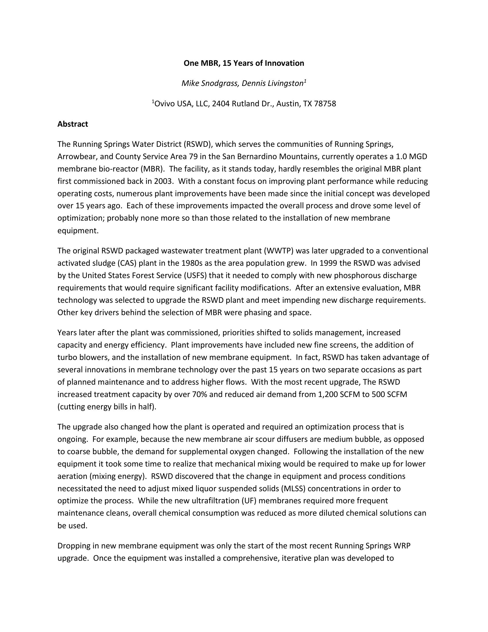 The Running Springs Water District (RSWD), which serves the communities of Running Springs, Arrowbear, and County Service Area 79 in the San Bernardino Mountains, currently operates a 1.0 MGD membrane bio-reactor (MBR). The facility, as it stands today, hardly resembles the original MBR plant first commissioned back in 2003. With a constant focus on improving plant performance while reducing operating costs, numerous plant improvements have been made since the initial concept was developed over 15 years ago. Each of these improvements impacted the overall process and drove some level of optimization; probably none more so than those related to the installation of new membrane equipment. The original RSWD packaged wastewater treatment plant (WWTP) was later upgraded to a conventional activated sludge (CAS) plant in the 1980s as the area population grew. In 1999 the RSWD was advised by the United States Forest Service (USFS) that it needed to comply with new phosphorous discharge requirements that would require significant facility modifications. After an extensive evaluation, MBR technology was selected to upgrade the RSWD plant and meet impending new discharge requirements. Other key drivers behind the selection of MBR were phasing and space. Years later after the plant was commissioned, priorities shifted to solids management, increased capacity and energy efficiency. Plant improvements have included new fine screens, the addition of turbo blowers, and the installation of new membrane equipment. In fact, RSWD has taken advantage of several innovations in membrane technology over the past 15 years on two separate occasions as part of planned maintenance and to address higher flows. With the most recent upgrade, The RSWD increased treatment capacity by over 70% and reduced air demand from 1,200 SCFM to 500 SCFM (cutting energy bills in half). The upgrade also changed how the plant is operated and required an optimization process that is ongoing. For example, because the new membrane air scour diffusers are medium bubble, as opposed to coarse bubble, the demand for supplemental oxygen changed. Following the installation of the new equipment it took some time to realize that mechanical mixing would be required to make up for lower aeration (mixing energy). RSWD discovered that the change in equipment and process conditions necessitated the need to adjust mixed liquor suspended solids (MLSS) concentrations in order to optimize the process. While the new ultrafiltration (UF) membranes required more frequent maintenance cleans, overall chemical consumption was reduced as more diluted chemical solutions can be used. Dropping in new membrane equipment was only the start of the most recent Running Springs WRP upgrade. Once the equipment was installed a comprehensive, iterative plan was developed to quantitatively optimize the process. Elements of the plan could prove useful in upgrading other plants, saving both time and money. Plant and system optimization can take on many forms and involve any aspect of an MBR. The following case study on Running Springs shows an example of an MBR system that has maintained a strong commitment to plant optimization and how every aspect of the plant is taken into consideration.