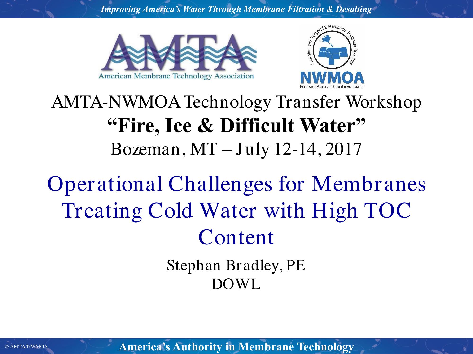 Raw waters with high TOC content present unique challenges to municipal treatment plant operators. These problems are exacerbated when the raw water is very cold. Plants in the Pacific Northwest are being subjected to raw water with increasing TOC content and regulations requiring lower disinfection byproducts. This presentation will discuss issues related to optimizing membrane plant operations with cold raw waters that contain high TOC levels. Environmental trends, regulatory trends, and operational challenges will be presented along with best practices to optimize treated water quality.