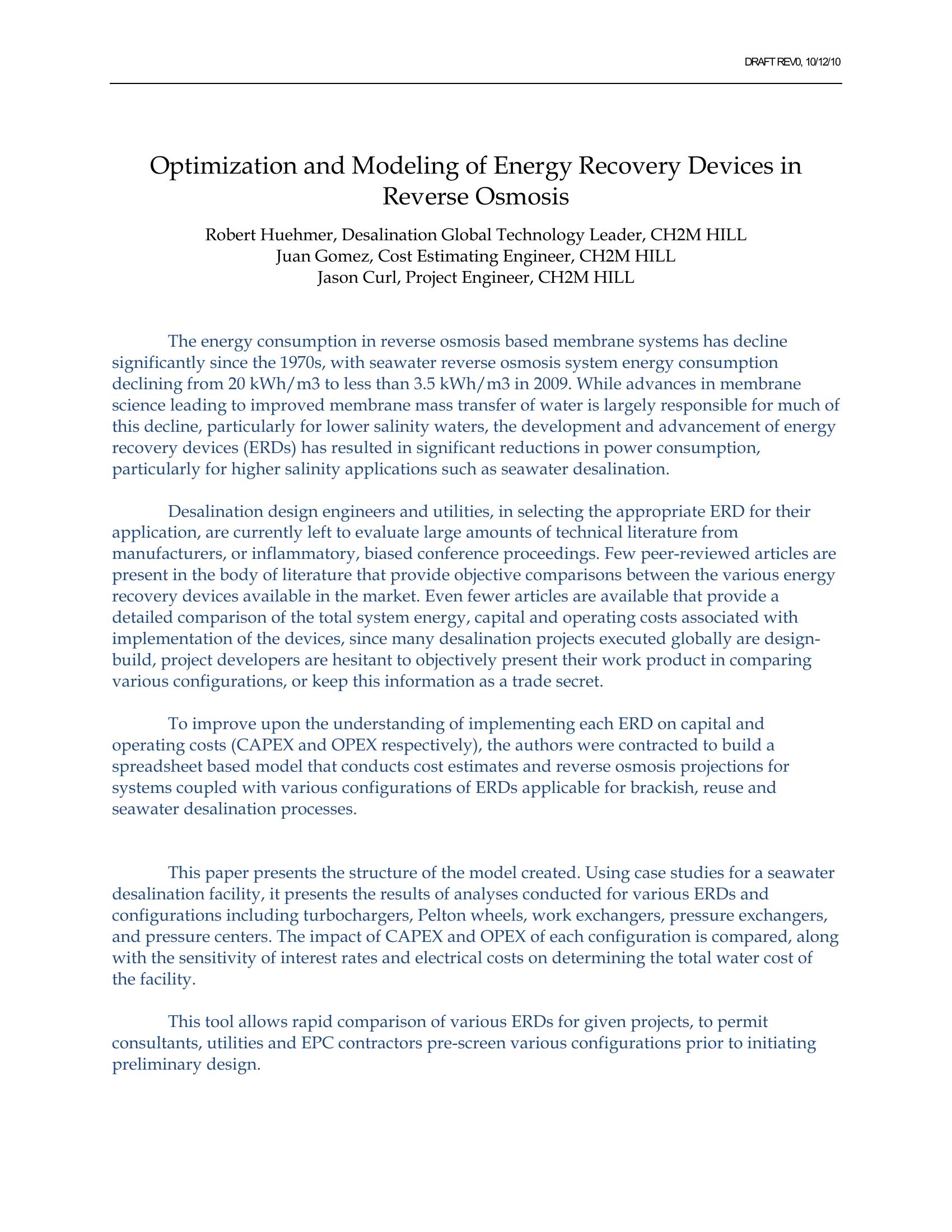 Optimization and Modeling of Energy Recovery Devices in Reverse Osmosis