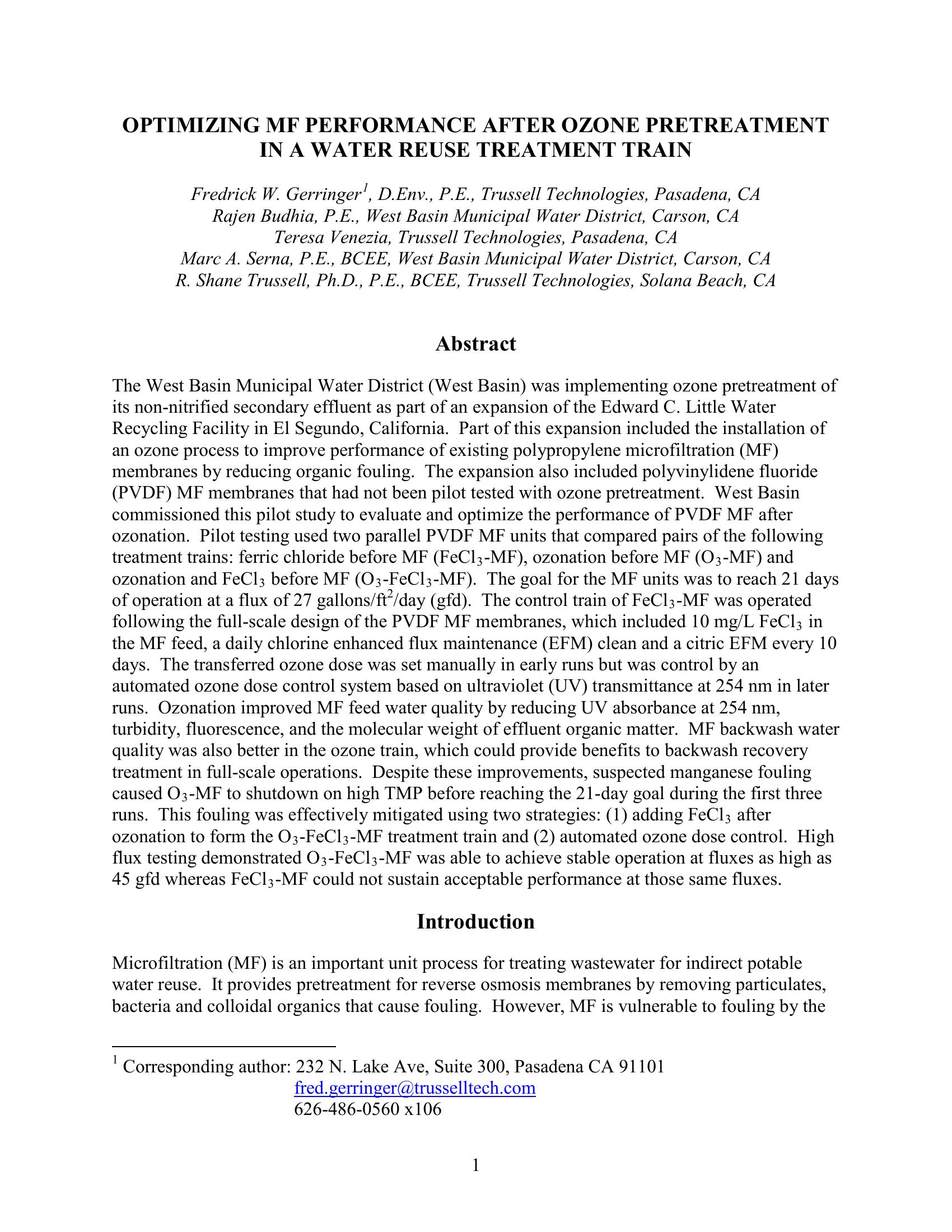 The West Basin Municipal Water District (West Basin) is implementing ozone pretreatment of its non-nitrified secondary effluent as part of an expansion of the Edward C. Little Water Recycling Plant (ECLWRF) in El Segundo, California. This project is intended to improve water production for existing polypropylene microfiltration (MF) membranes in the seawater intrusion barrier water treatment train at ECLWRF. However, additional MF capacity in the expansion is provided by polyvinylidene fluoride (PVDF) membranes. In preparation for full-scale design and operation of ozonation with the new MF units, West Basin commissioned a pilot study to examine the effect of ozone pretreatment on the operation of PVDF MF membranes. Unexpected challenges with inorganic fouling were encountered and resolved during pilot testing. Ozone pretreatment was found to improve MF performance beyond the original design criteria.