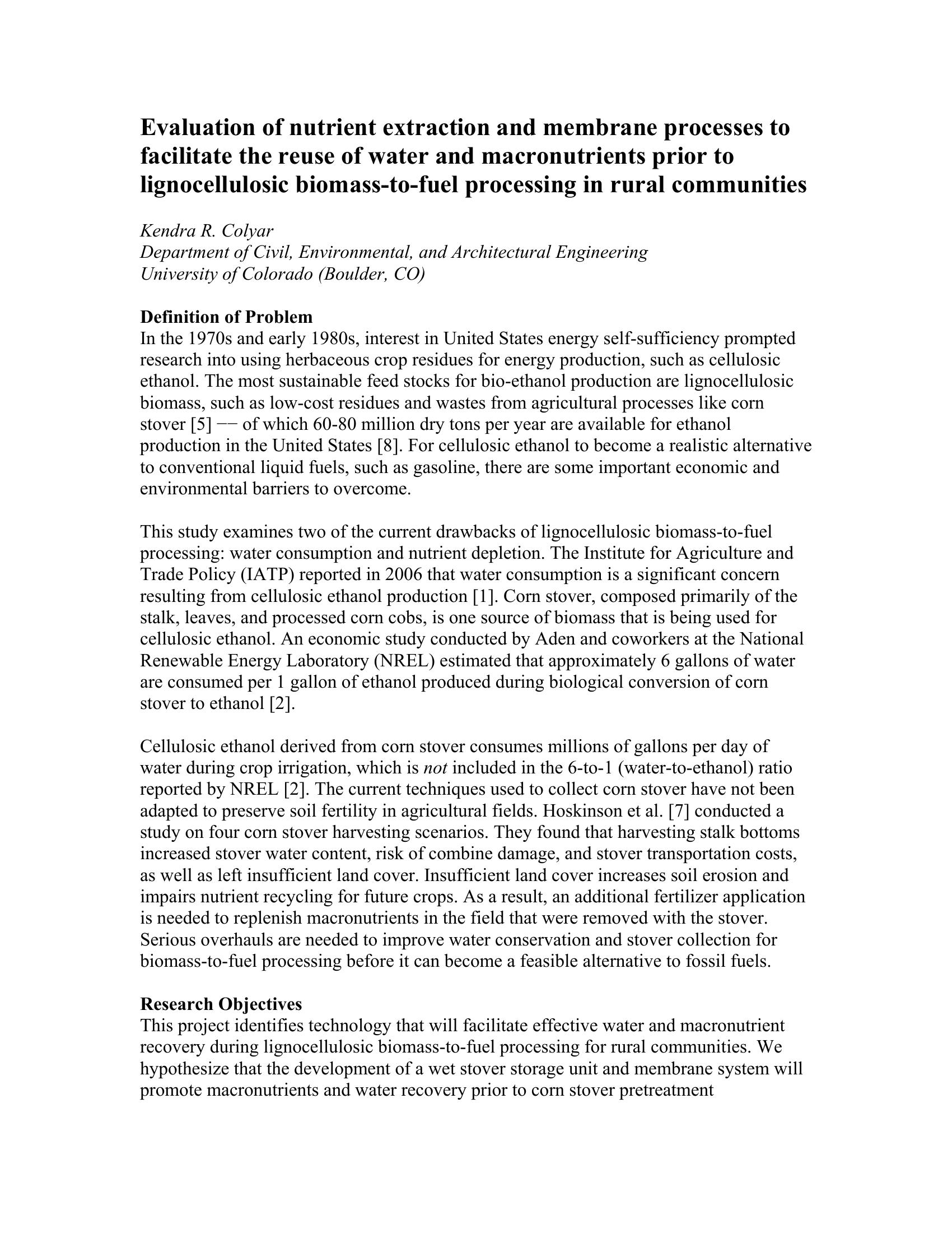 This paper describes a project that identifies technology that will facilitate effective water and macronutrient recovery during lignocellulosic biomass-to-fuel processing for rural communities.