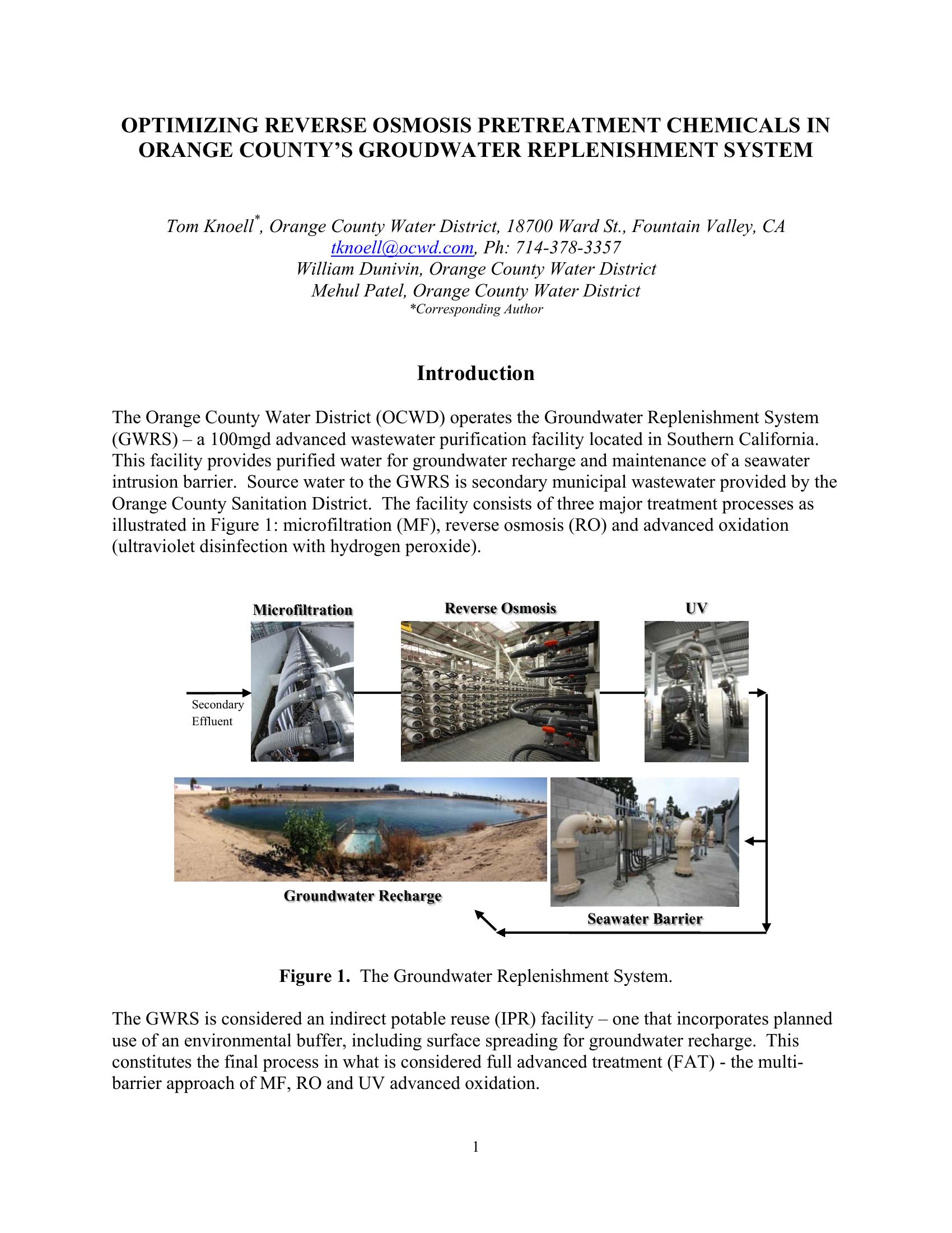 Report on optimizing RO pretreatment chemicals at Orange County Water District’s (OCWD) 100 mgd Ground Water Replenishment System (GWRS); an advanced wastewater purification facility in Southern California. The source water to this facility is secondary municipal wastewater from the Orange County Sanitation District. The GWRS consist of major treatment processes: microfiltration (MF), reverse osmosis (RO) and advanced oxidation disinfectiom (ultraviolet and hydrogen peroxide).