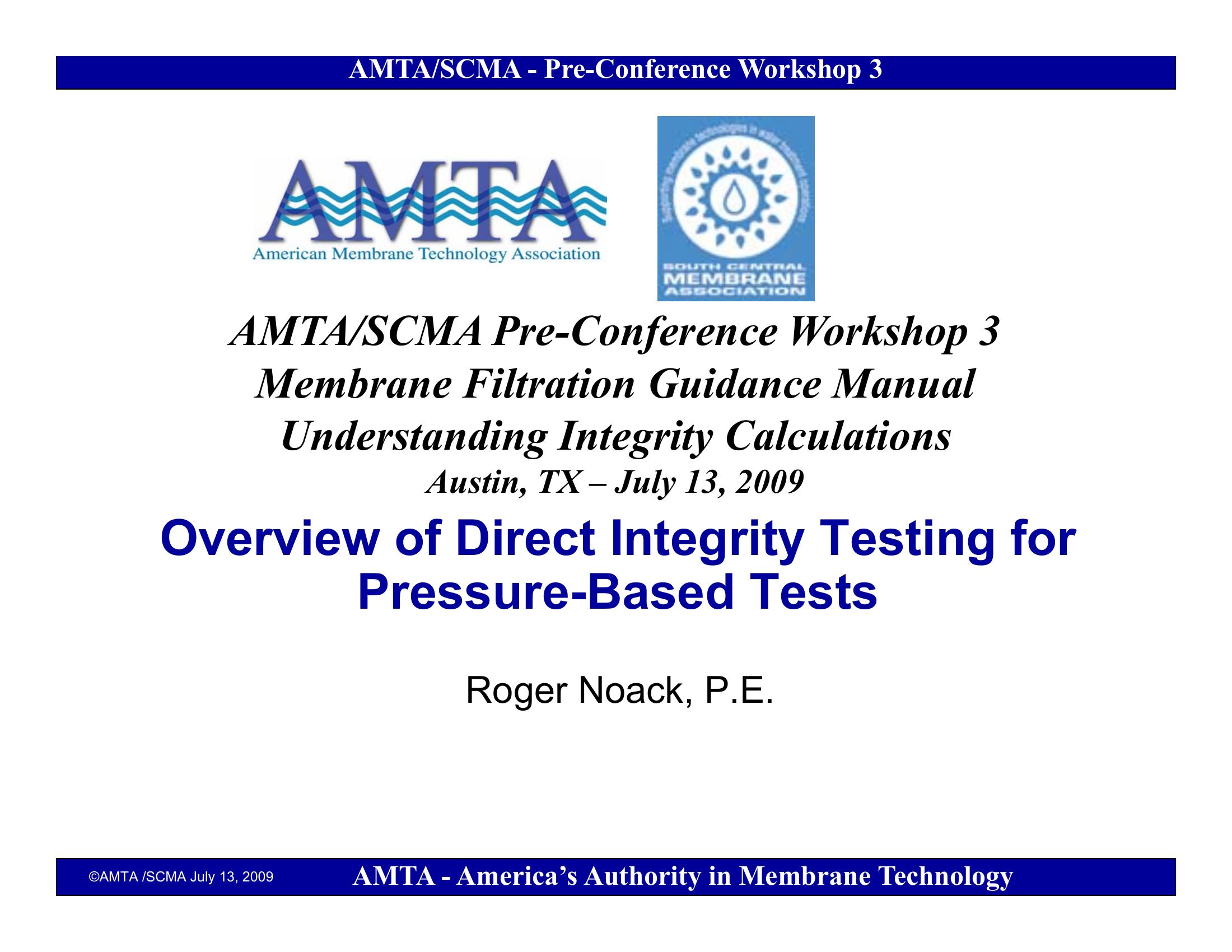 This paper provides an overview of Direct Integrity Testing for Pressure-Based Tests. Membrane Integrity Testing has become the means of determining compliance with regulations. Testing pressure for pressure-based direct Integrity Testing is the most important parameter. The full-scale challenge test is the best indicator for the sensitivity and reliability of an Integrity Test method. Testing frequency should be based on a risk-based approach that embraces both the occurrence and consequences of an integrity breach. The probable occurrence of and integrity breach can be determined through durability tests and/or data from existing plants. Membrane systems that have an easy means to locate and repair the breach can save time and improve plant productivity.