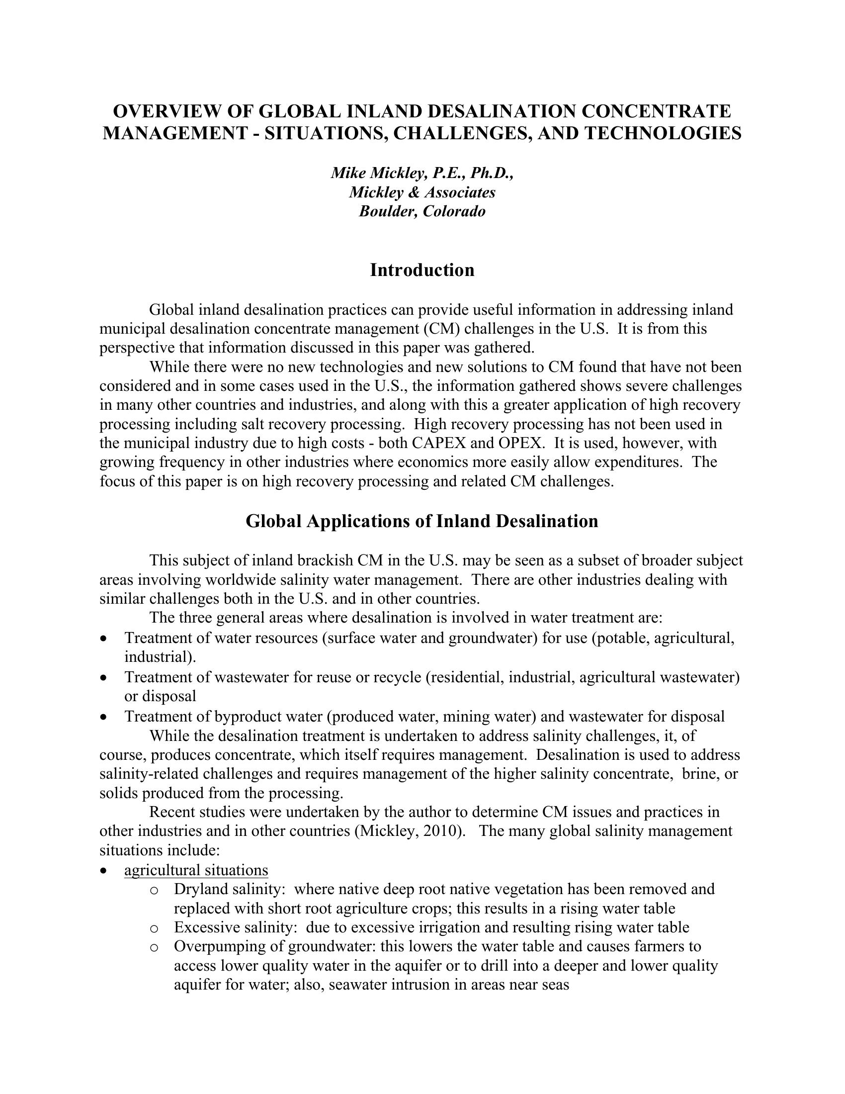 Overview of Global Inland Desalination Concentrate Management – Situations, Challenges, and Technologies