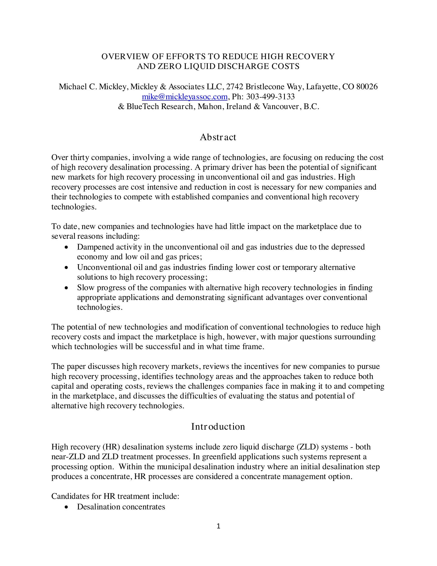 Overviewe of Efforts to Reduce High Recovery and Zero Liquid Discharge Costs