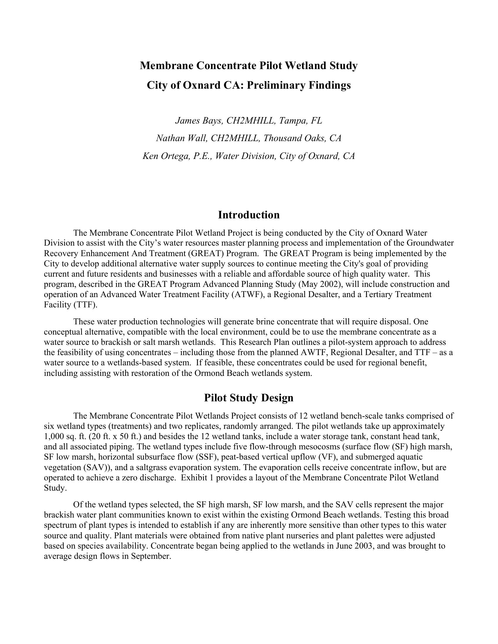 This paper describes the membrane concentrate Pilot Wetland Project conducted by the City of Oxnard Water Division to assist with the City’s water resources master planning process and implementation of the Groundwater Recovery Enhancement And Treatment (GREAT) Program.