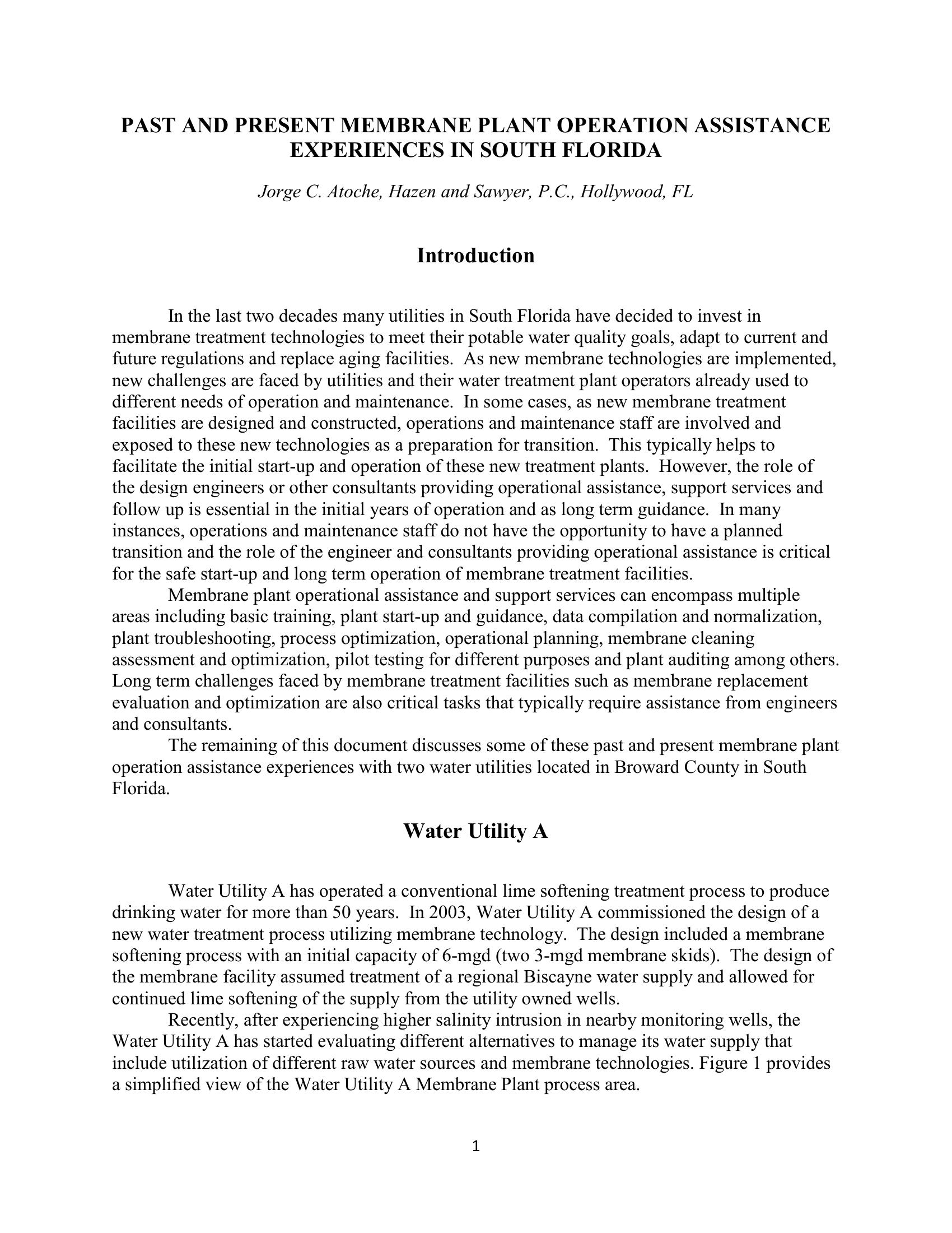 Past and Present Membrane Plant Operation Assistance Experience in South Florida