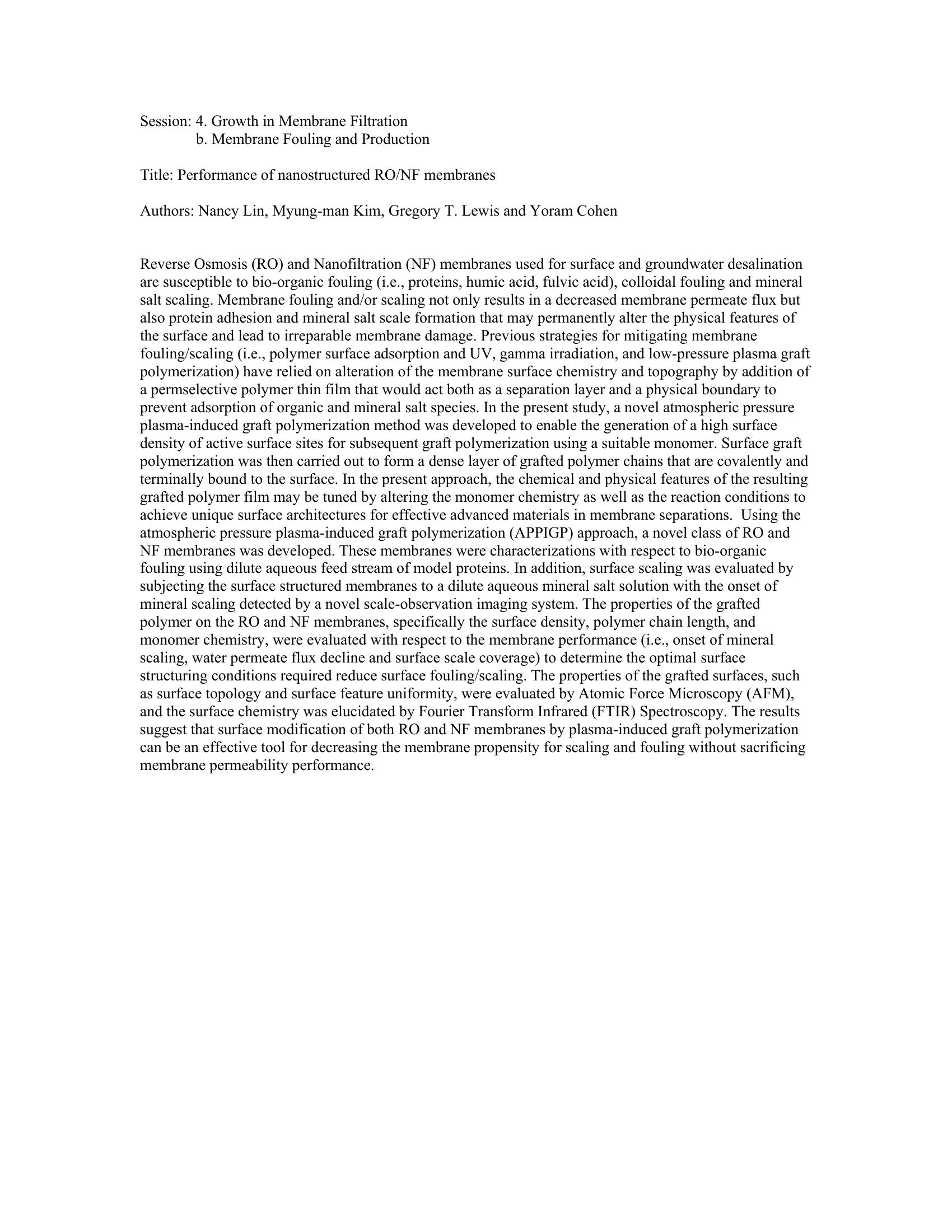 Thin-film composite polyamide membrane has been the dominant membrane used for reverse osmosis and nanofiltration since its development by Cadotte and co-workers. However, in inland brackish water desalination (including desalting of treated municipal wastewater), fouling (due to both inorganic salt scaling and organic fouling) of RO/NF membranes pose a major bottleneck to increasing process efficiency. A new class of surface nano-structuring polyamide thin-film composite (SNS-PA-TFC) membranes were synthesized via atmospheric pressure plasma induced graft polymerization (APPIGP) [4]. Surface activation was achieved by exposing the surface to an impinging atmospheric plasma source, followed by free radical graft polymerization (FRGP) in an aqueous monomer solution. Surface nano-structured polyamide thin-film composite (SNS-PA-TFC) membranes were prepared in a three step process. SNS-PA-TFC membrane performance was evaluated with respect to gypsum scaling using a laboratory plate-and-frame RO (PFRO) system. The PFRO system was equipped with an optimal membrane imaging hardware and software to allow direct visual observations of the membrane surface and detection of mineral scale on the RO membranes under high pressure. Gypsum scaling tests demonstrated that the SNS-PA-TFC membranes had significantly lower scaling propensity compared to LFC1 membrane. Current efforts are underway to simultaneously tune the polymer brush layer structure (and polymer type) to increase organic and bio-fouling resistance of the membranes while maintaining (or even increasing) the present level of reduced scaling propensity and high permeability.