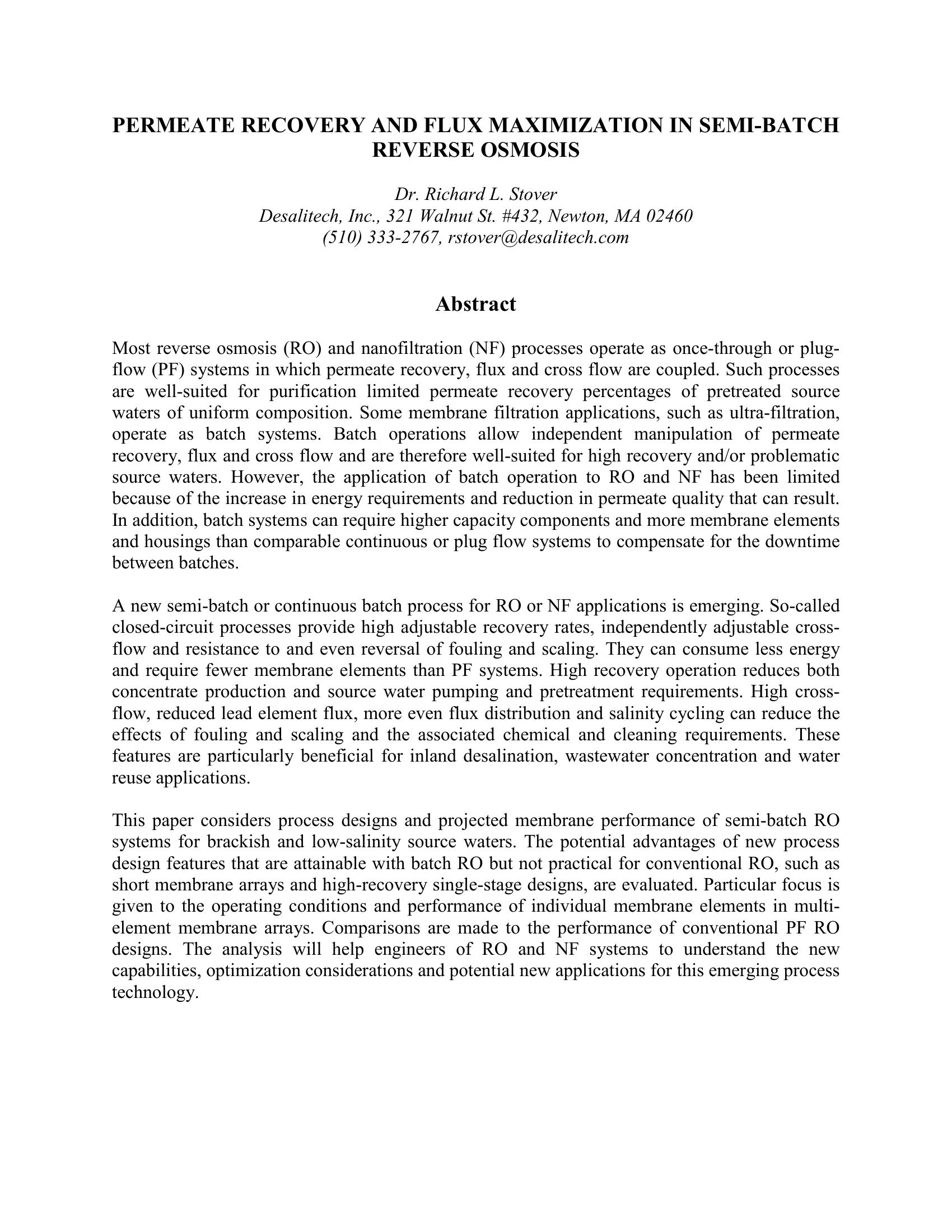 | Keywords | Reverse Osmosis, Semi-Batch Process, Permeate Recovery |