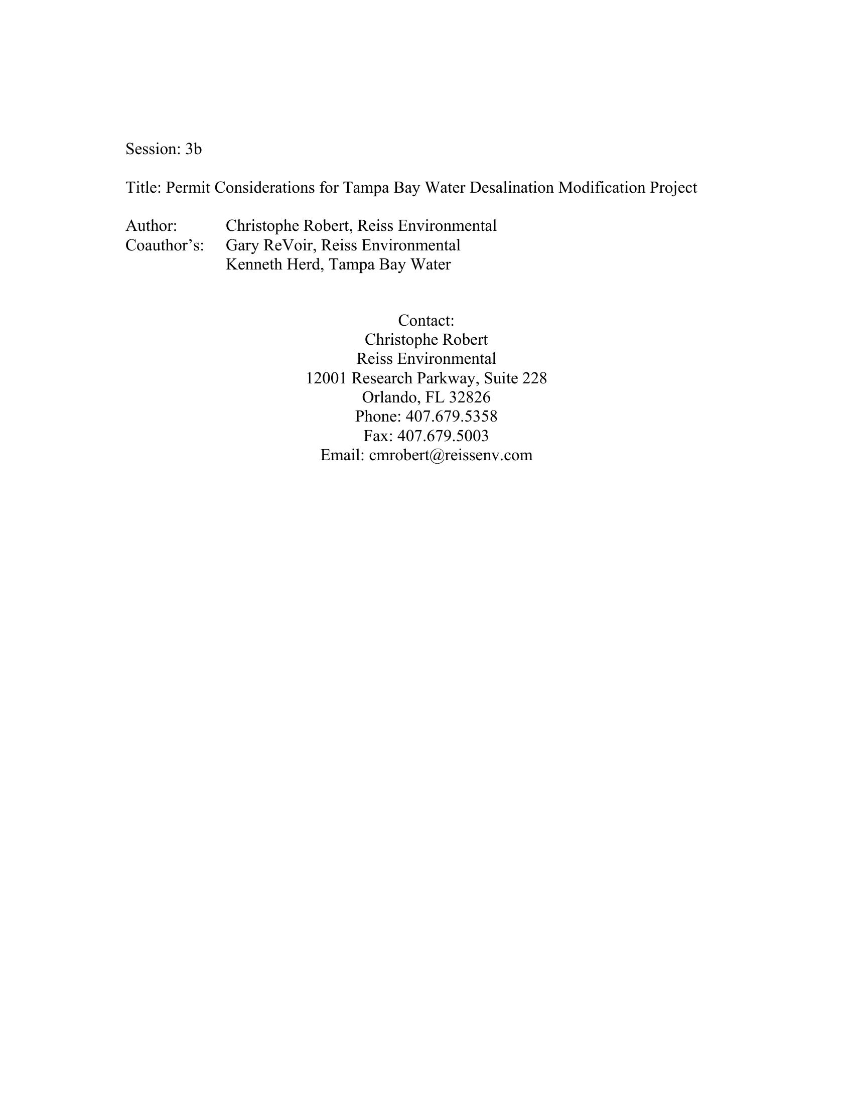 Tampa Bay Water owns a 25 MGD Seawater Desalination Facility on the West Coast of Florida to treat seawater from the Gulf and sale the water to the six governments (3 cities and 3 counties). In the past, performance of the seawater facility has not met the goals set by Tampa Bay Water. In order to improve performance, Tampa Bay Water went through competitive bids for pilot study, design and construction of the facility modifications. Prior to the modifications, the seawater desalination facility consisted of in-line coagulation, dual stage sand filtration, reverse osmosis, pH adjustment and disinfection. The modifications to improve performance of the facility consist of adding a conventional coagulation/flocculation-sedimentation prior to sand filtration and adding a diatomaceous earth filtration treatment downstream the sand filtration. In addition, post treatment pH adjustment process was modified. Prior to the construction of the modifications, six permits had to be issued by State and local agencies such as the Florida Department of Environmental Protection, Hillsborough County and Hillsborough County Environmental Protection Commission. In addition to obtain the six permits, schedule was of importance due to fast track project schedule. This paper will present the different steps, requirements, preliminary studies and laboratory analyses necessary to obtain the various permits for the reverse osmosis facility modifications within a tight schedule. A pilot study was performed during the permit process in order to support the application packages. Concentrate and sludge were generated such as characterization and specific analyses were performed.