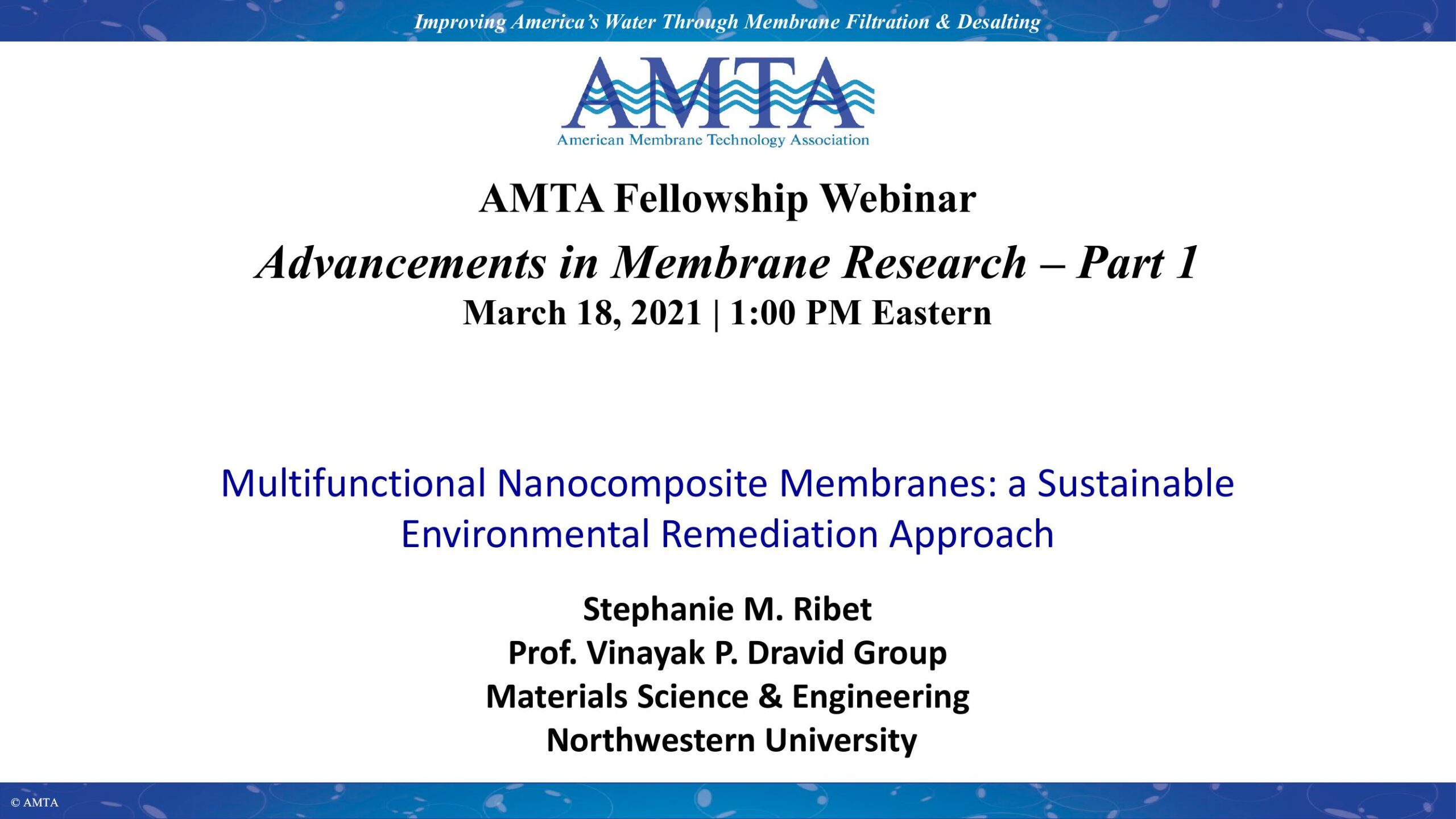 Aqueous phosphate pollution can negatively impact myriad ecosystems and introduces a variety of economic and public health problems. While novel remediation tactics based on nanoparticle binding have shown considerable promise in nutrient recovery from water, they are difficult to deploy at scale. The Dravid group has developed a membrane-based platform approach for environmental remediation of aqueous pollutants. Here, a nanocomposite slurry applied to a membrane by a facile, yet effective dip-coating process serves as an affinity coating, tailored for specific pollutants. This scalable, economically viable, and environmentally friendly approach is demonstrated with our phosphate elimination and recovery lightweight (PEARL) membrane, which can selectively sequester >99% of phosphate ions from solution. Mild tuning of pH promotes at-will adsorption and desorption of nutrients, allowing for phosphate recovery and PEARL membrane reuse. Moreover, we characterize the interfaces of the structure across various length scales to unravel clues about the specific binding mechanism, which provides insight into how the PEARL membrane approach can be extended to address other pollutants. This presentation will provide details on the performance of the PEARL membrane and its structure, as well as discuss how this strategy can be extended to other emerging contaminants.