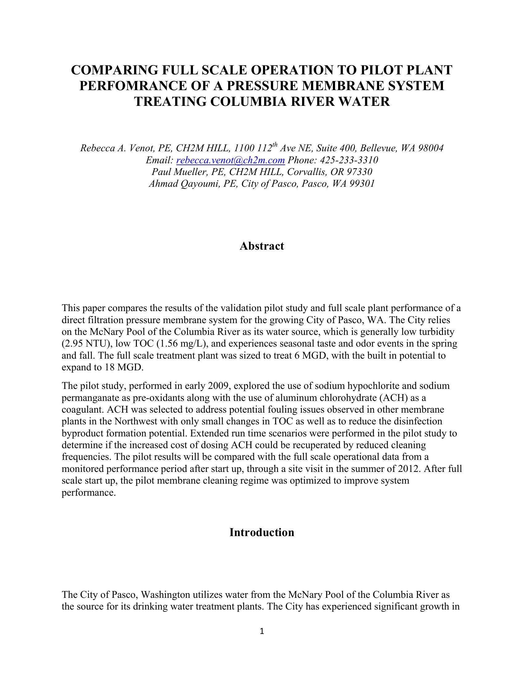 This paper compares the results of the validation pilot study and full scale plant performance of a direct filtration pressure membrane system for the growing City of Pasco, WA. The City relies on the McNary Pool of the Columbia River as its water source, which is generally low turbidity, low TOC and experiences seasonal taste and odor events in the spring and fall. The full scale treatment plant was sized to treat 6 MGD, with the built in potential to expand to 18 MGD. The pilot study, performed in early 2009, explored the use of sodium hypochlorite and sodium permanganate as pre-oxidants along with the use of aluminum chlorohydrate (ACH) as a coagulant. ACH was selected to address potential fouling issues observed in other membrane plants in the Northwest with only small changes in TOC as well as to reduce the disinfection byproduct formation potential. Extended run time scenarios were performed in the pilot study to determine if the increased cost of dosing ACH could be recuperated by reduced cleaning frequencies. The pilot results will be compared with the full scale operational data from a monitored performance period after start up, through a site visit in the summer of 2012.