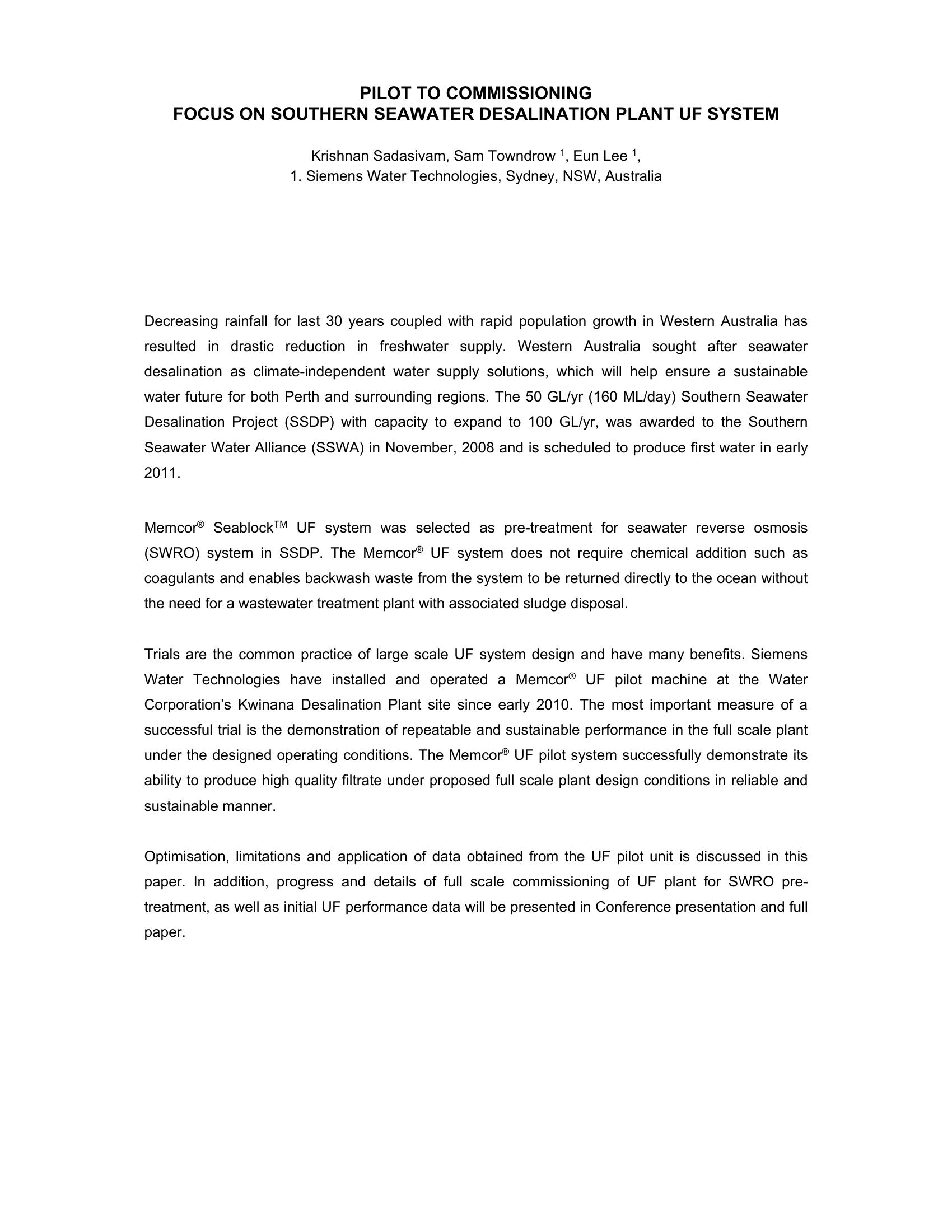 | Keywords | Binningyup. Australia, Perth Seawater Desalination Plant, ultrafiltration |