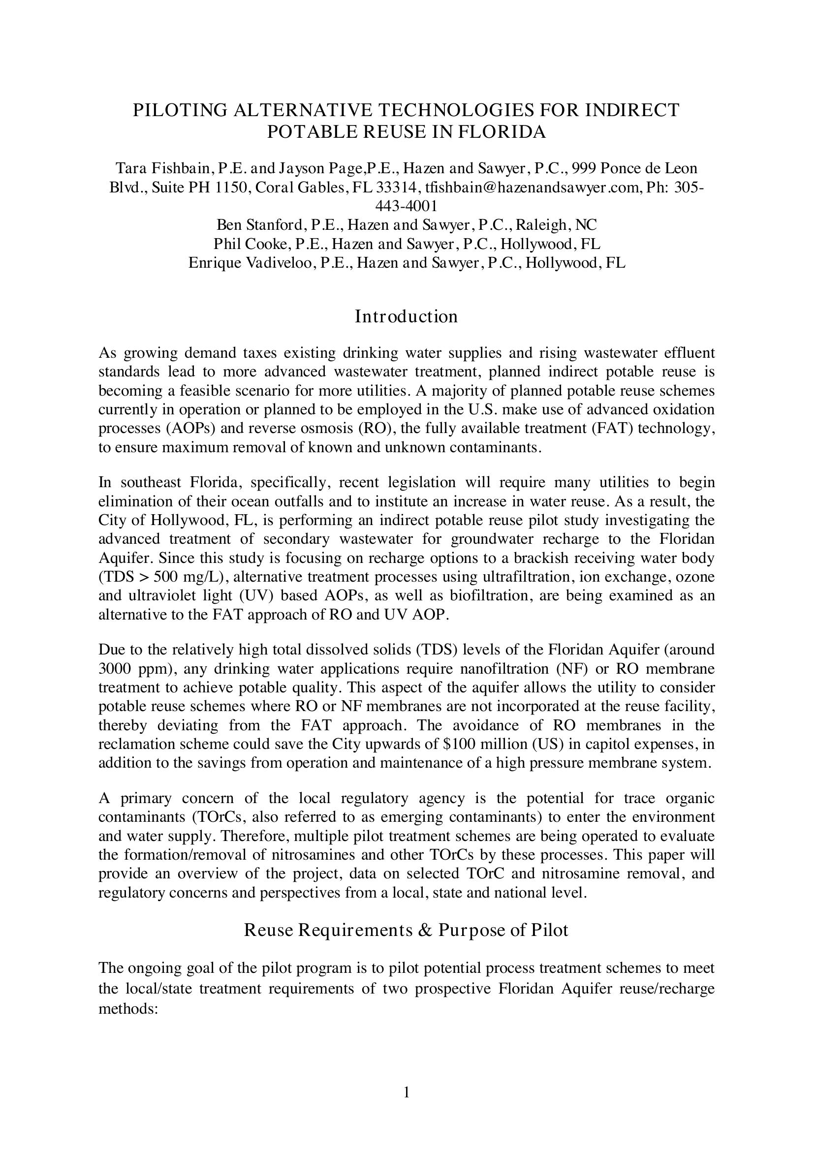 As growing demand taxes existing drinking water supplies and rising wastewater effluent standards lead to more advanced wastewater treatment, planned indirect potable reuse is becoming a feasible scenario for more utilities. A majority of planned potable reuse schemes currently in operation or planned to be employed in the U.S. make use of advanced oxidation processes (AOPs) and reverse osmosis (RO), the fully available treatment (FAT) technology, to ensure maximum removal of known and unknown contaminants. In southeast Florida, specifically, recent legislation will require many utilities to begin elimination of their ocean outfalls and to institute an increase in water reuse. As a result, the City of Hollywood, FL, is performing an indirect potable reuse pilot study investigating the advanced treatment of secondary wastewater for groundwater recharge to the Floridan Aquifer