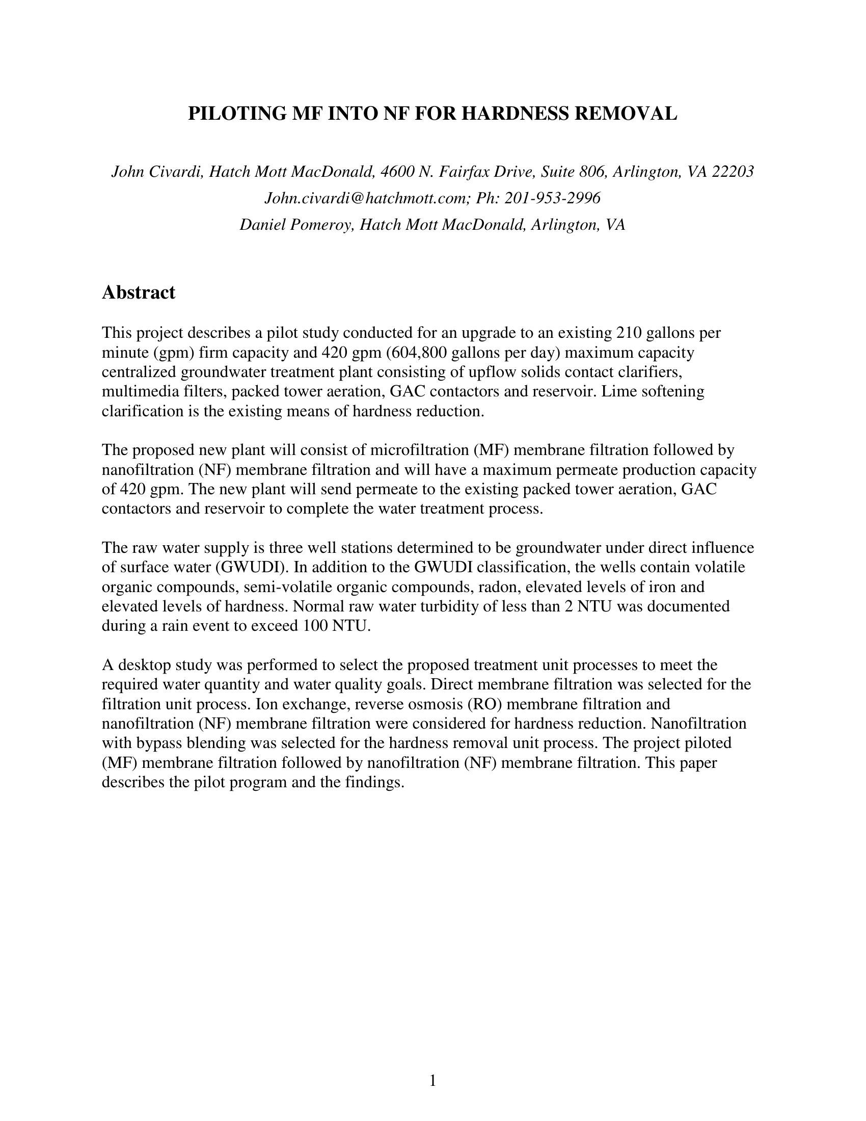This paper describes the pilot program for treating a surface water for hardness reduction and the findings. Direct membrane filtration was selected for the filtration unit process. Nanofiltration with bypass blending was selected for the hardness removal unit process. The proposed new plant will have a maximum permeate production capacity of 420 gpm. The new plant will send permeate to the existing packed tower aeration, GAC contactors and reservoir to complete the water treatment process