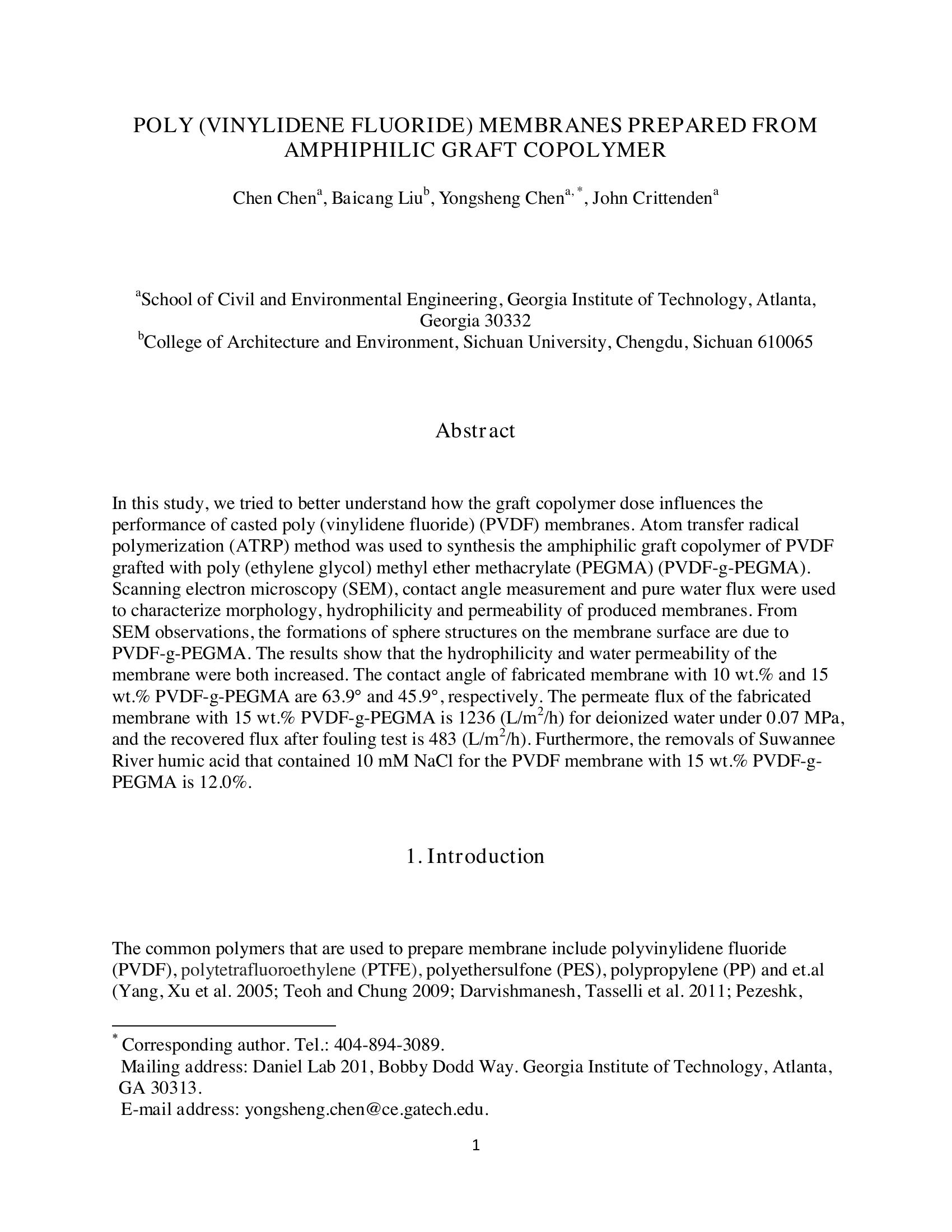 | Keywords | Poly Membranes, Vinylidene Fluoride, Amphiphilic Graft Copolymer |