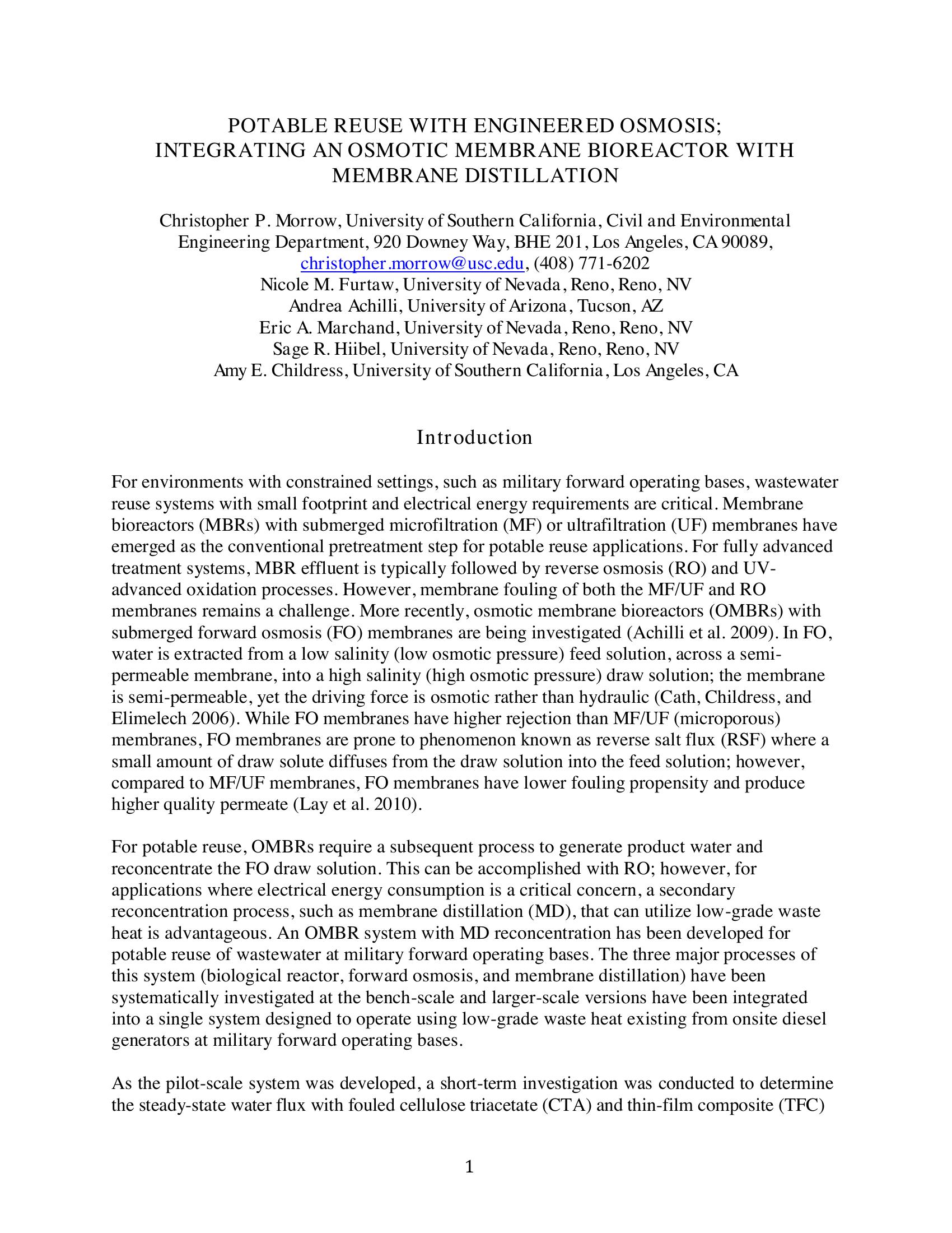 | Keywords | Potable reuse, Osmotic membrane bioreactor, Membrane distillation |
