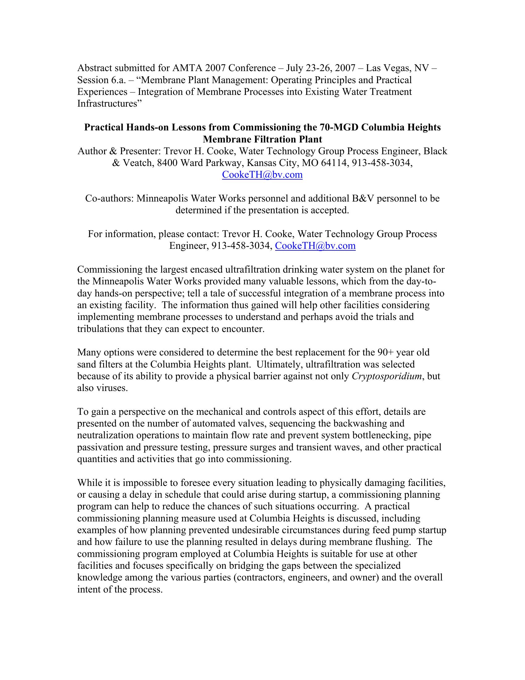 This paper describes practical Hands-on lessons from commissioning the 70-MGD Columbia Heights Membrane Filtration Plant