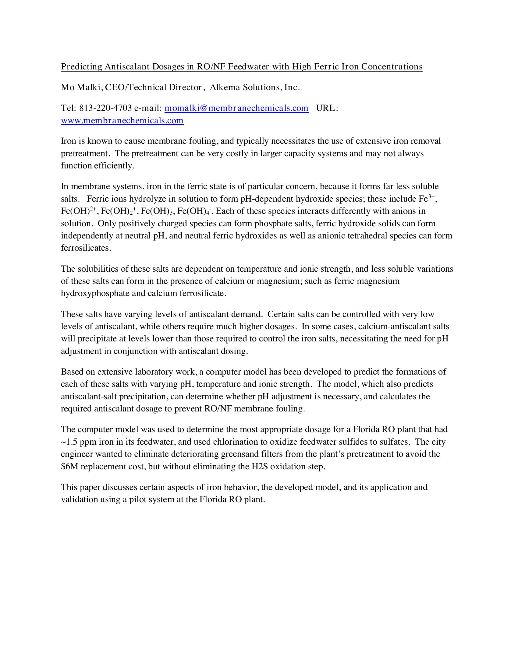 | Keywords | modeling, iron, piloting, antiscalant, reverse osmosis |