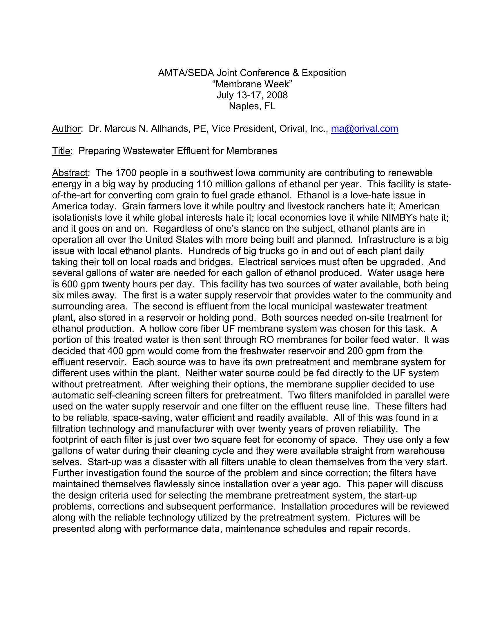 This paper will discuss the design criteria used for selecting a membrane pretreatment system, for the water needed at an Ethanol Plant in Iowa, it discusses the start-up problems, corrections and subsequent performance. Installation procedures are reviewed along with the reliable technology utilized by the pretreatment system. This ethanol plant is drawing up to one-third of its needed water from reusable effluent. Appropriate technologies are being used to maintain the quality of water for boilers, cooling towers, wash water and other onsite water requirements. Screen and membrane technologies combine to provide the exact quality of water necessary to keep production flowing regardless of raw water sources.