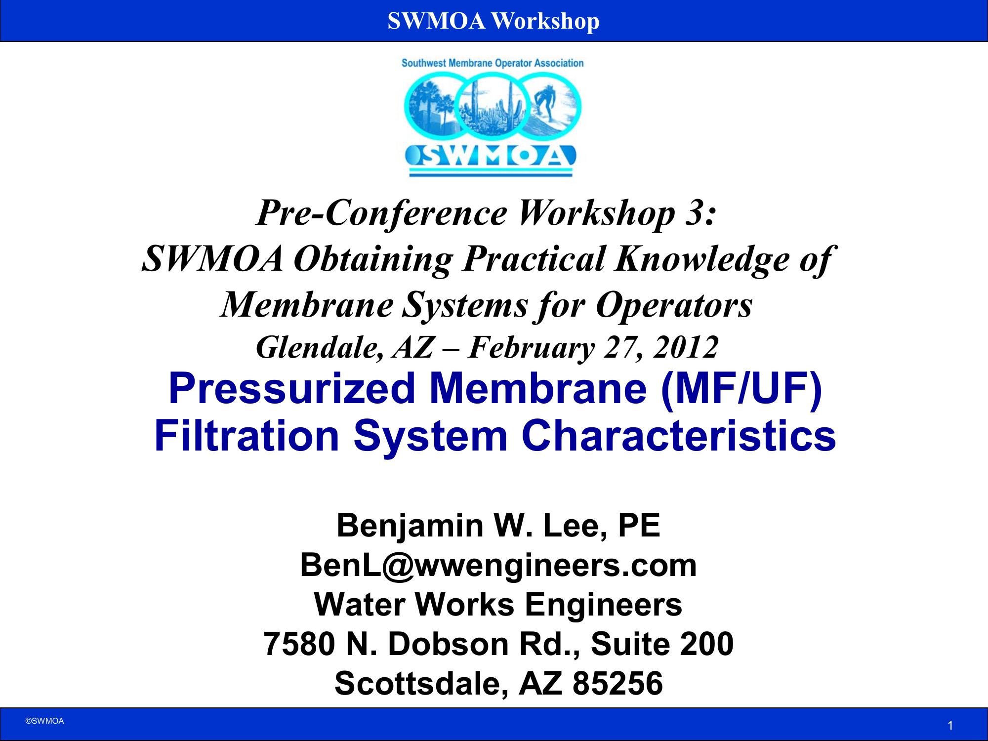 This presentation provides a comprehensive overview of pressurized membrane (MF/UF) filtration system characteristics. Definitions, basic principles, membrane configurations, membrane materials, modules, and regulatory requirements are summarized. In the regulatory requirements section, discussion of various removal credit considerations and challenge/integrity tests are covered.