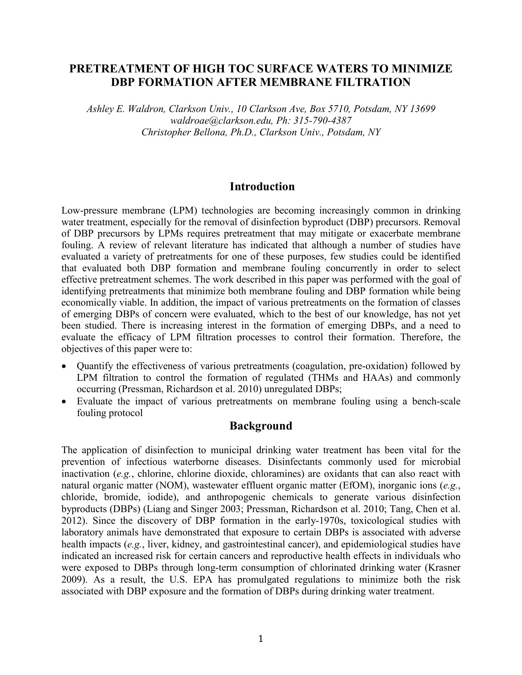 Pretreatment of High TOC Surface Waters to Minimize DBP Formation after Membrane Filtration