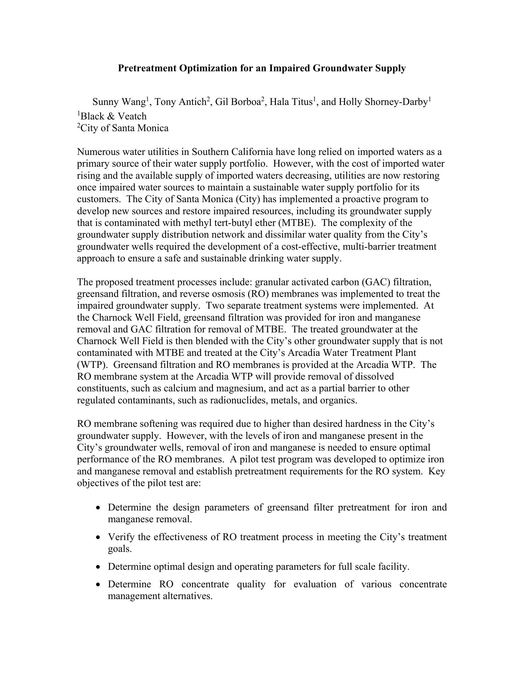 To offset imported State Project Water, the City of Santa Monica is resuming the use of local, impaired groundwater resources contaminated with MTBE and TBA. Using membrane softening, these contamnants are effectively removed. However, ambient iron and manganese levels prematurely foul the softening membranes. Optimized green sand filtration with chlorine resolved the fouling issues at the pilot scale.