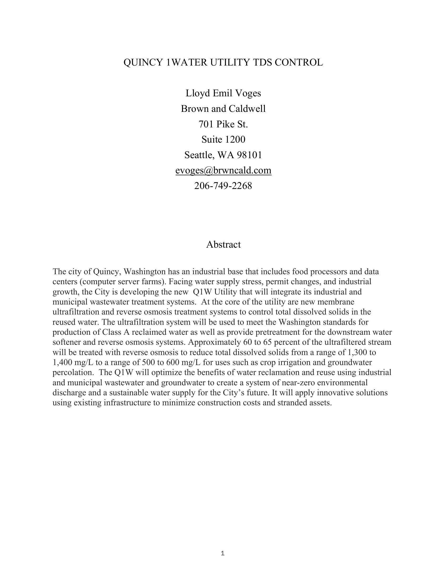 The paper describes the new Q1W Utility that will integrate its industrial and municipal wastewater treatment systems in Quincy, Washington. At the core of the utility are new membrane ultrafiltration and reverse osmosis treatment systems to control total dissolved solids in the reused water. The ultrafiltration system will be used to meet the Washington standards for production of Class A reclaimed water as well as provide pretreatment for the downstream water softener and reverse osmosis systems. The Q1W will optimize the benefits of water reclamation and reuse using industrial and municipal wastewater and groundwater to create a system of near-zero environmental discharge and a sustainable water supply for the City?s future