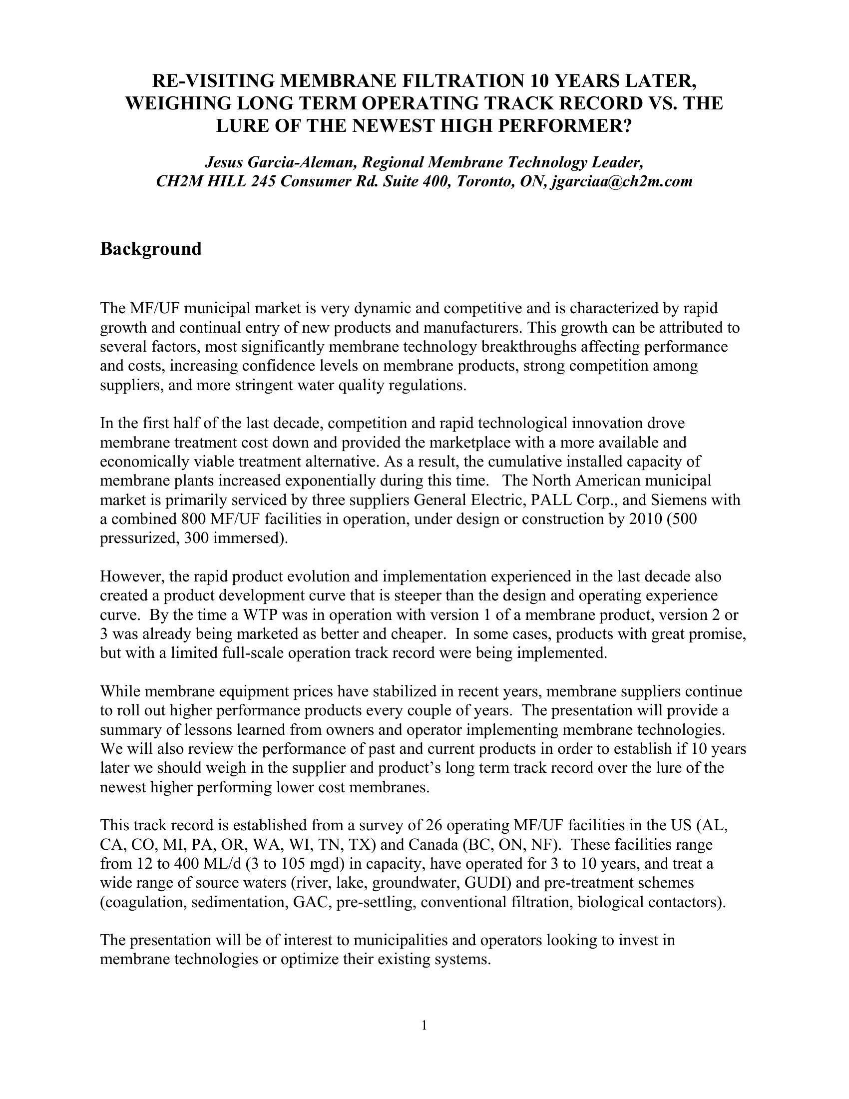 Re-visiting Membrane Filtration 10 Years Later, Weighing Long Term Operating Track Record vs. the Lure of the Newest High Performer?