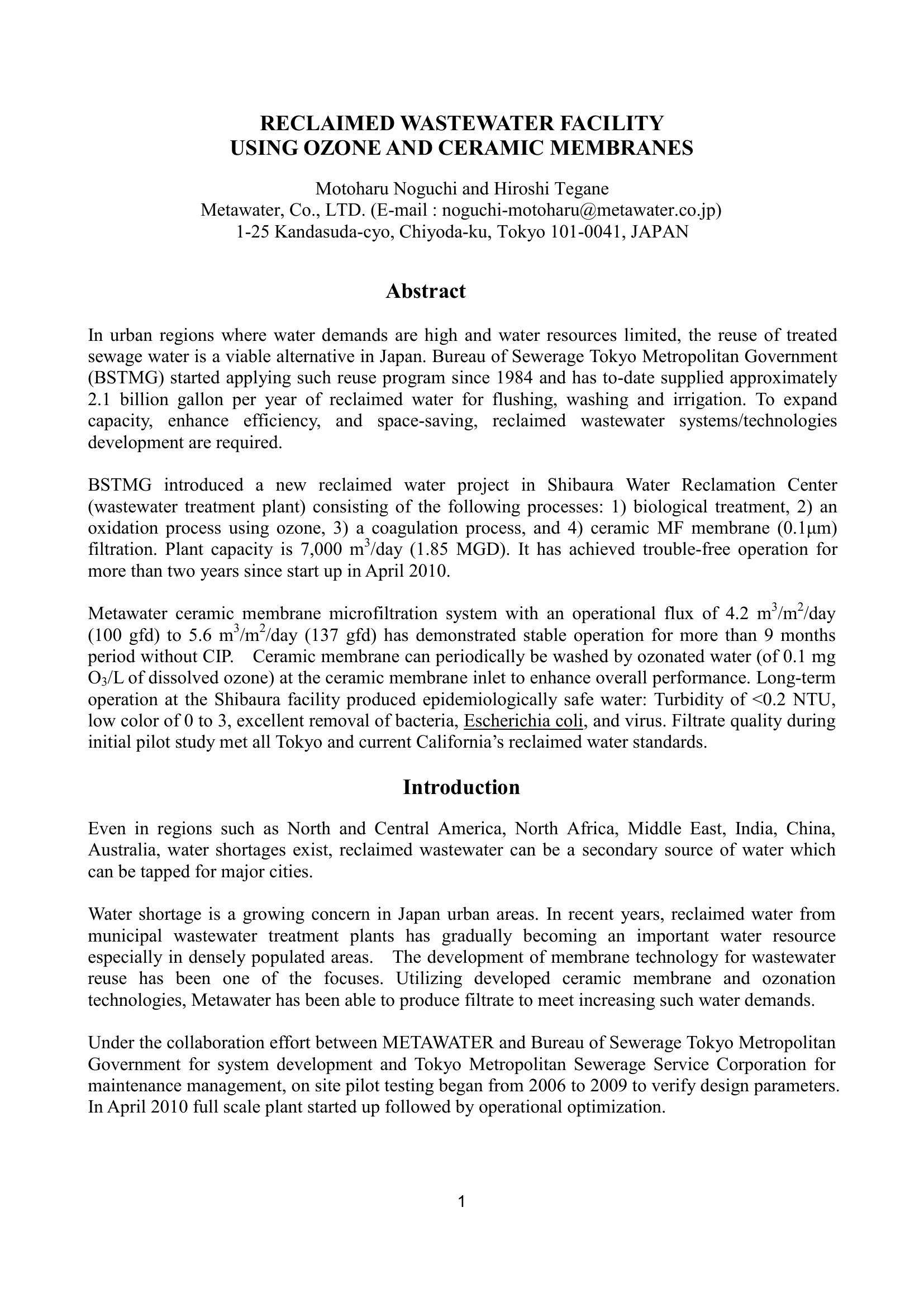 This paper is a case study that covers the use of ceramic membranes and ozone on the Shibaura Water Reclamation Center facility. This facility uses ozone technology to enhance coagulation. The system also uses ceramic membrane filtration to permit a higher flux rate and remove any potential of broken fibers. The performance and operating costs of this system is covered in detail.
