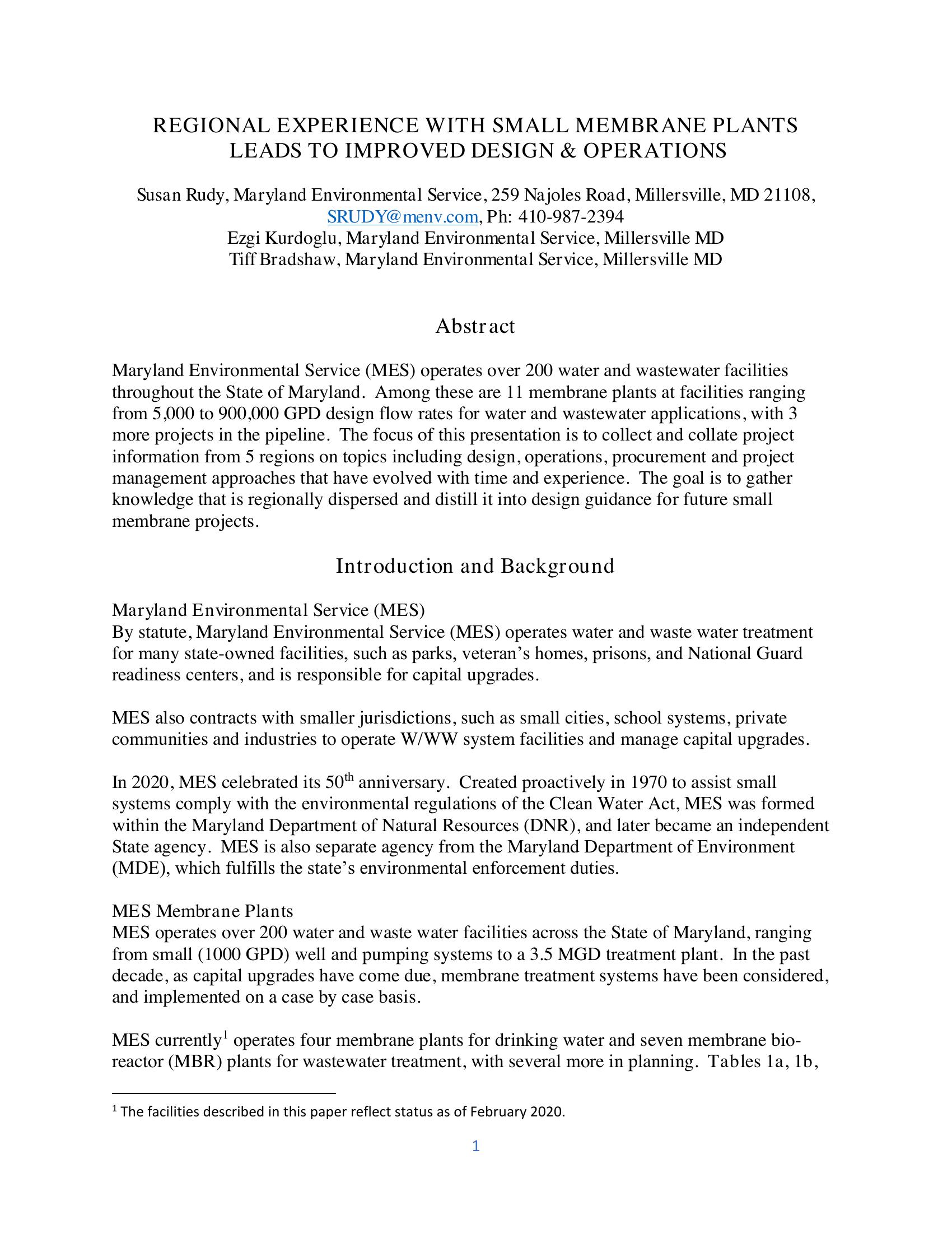 Maryland Environmental Service (MES) operates over 200 water and wastewater facilities throughout the State of Maryland. Among these are 11 membrane plants at facilities ranging from 5,000 to 900,000 GPD design flow rates for water and wastewater applications, with 3 more projects in the pipeline. The focus of this presentation is to collect and collate project information from 5 regions on topics including design, operations, procurement and project management approaches that have evolved with time and experience. The goal is to gather knowledge that is regionally dispersed and distill it into design guidance for future small membrane projects.