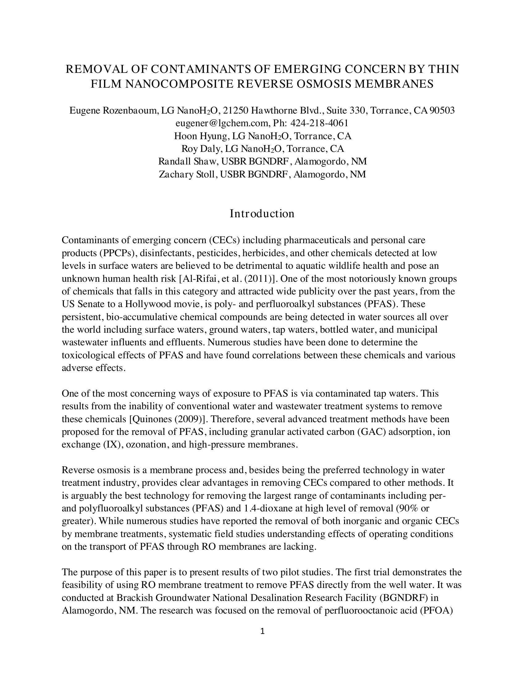 Contaminants of emerging concern (CECs) are believed to be detrimental to aquatic wildlife health and pose a human health risk. Existing conventional water treatment plants are not designed to remove CECs. Therefore, several advanced treatment methods, including reverse osmosis have been proposed for the removal of CECs.The paper will present two pilot studies. The first trial was conducted in collaboration with The Brunswick County Northwest Water Treatment Plant and the other in collaboration with Brackish Groundwater National Desalination Research Facility in Alamogordo, NM. The paper will present results on the removal rates of PFAS and other CECs as well as the long-term performance of the Thin Film Nanocomposite (TFN) membranes with respect to PFAS removal.