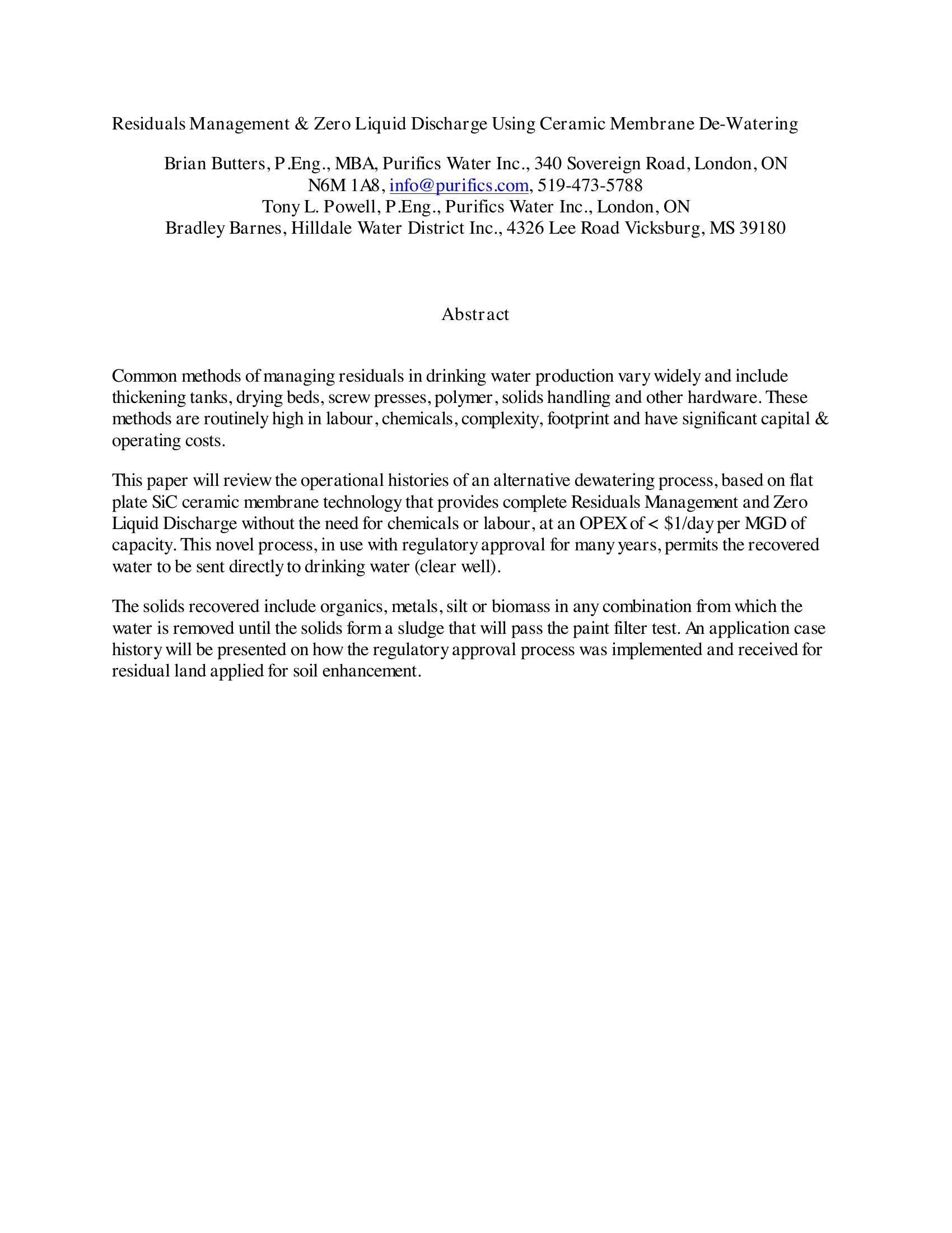Residuals Management & Zero Liquid Discharge Using Ceramic Membrane De-Watering