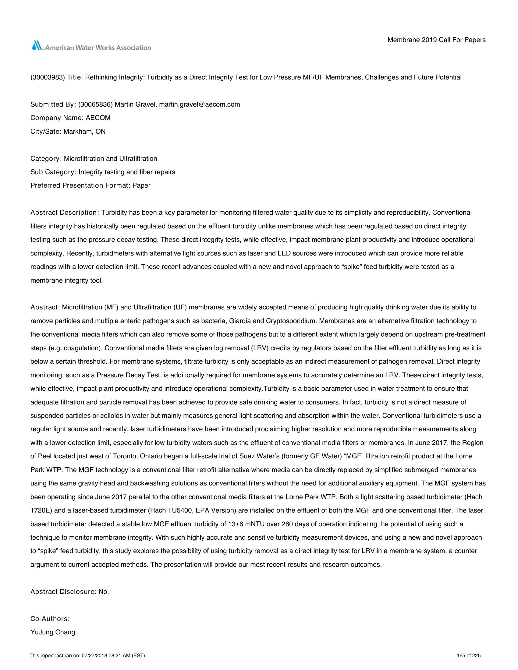 Rethinking Integrity: Turbidity as a Direct Integrity Test for Low Pressure MF/UF Membranes, Challenges and Future Potential