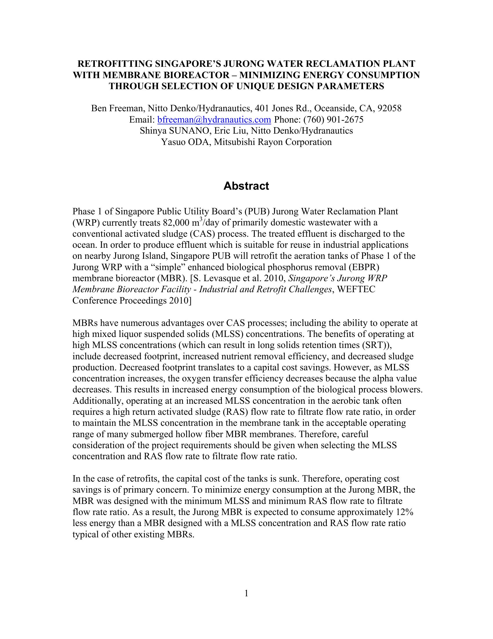 Retrofitting Singapore’s Jurong Water Reclamation Plant with Membrane Bioreactor – Minizing Energy Consumption through Selection of Unique Design Parameters