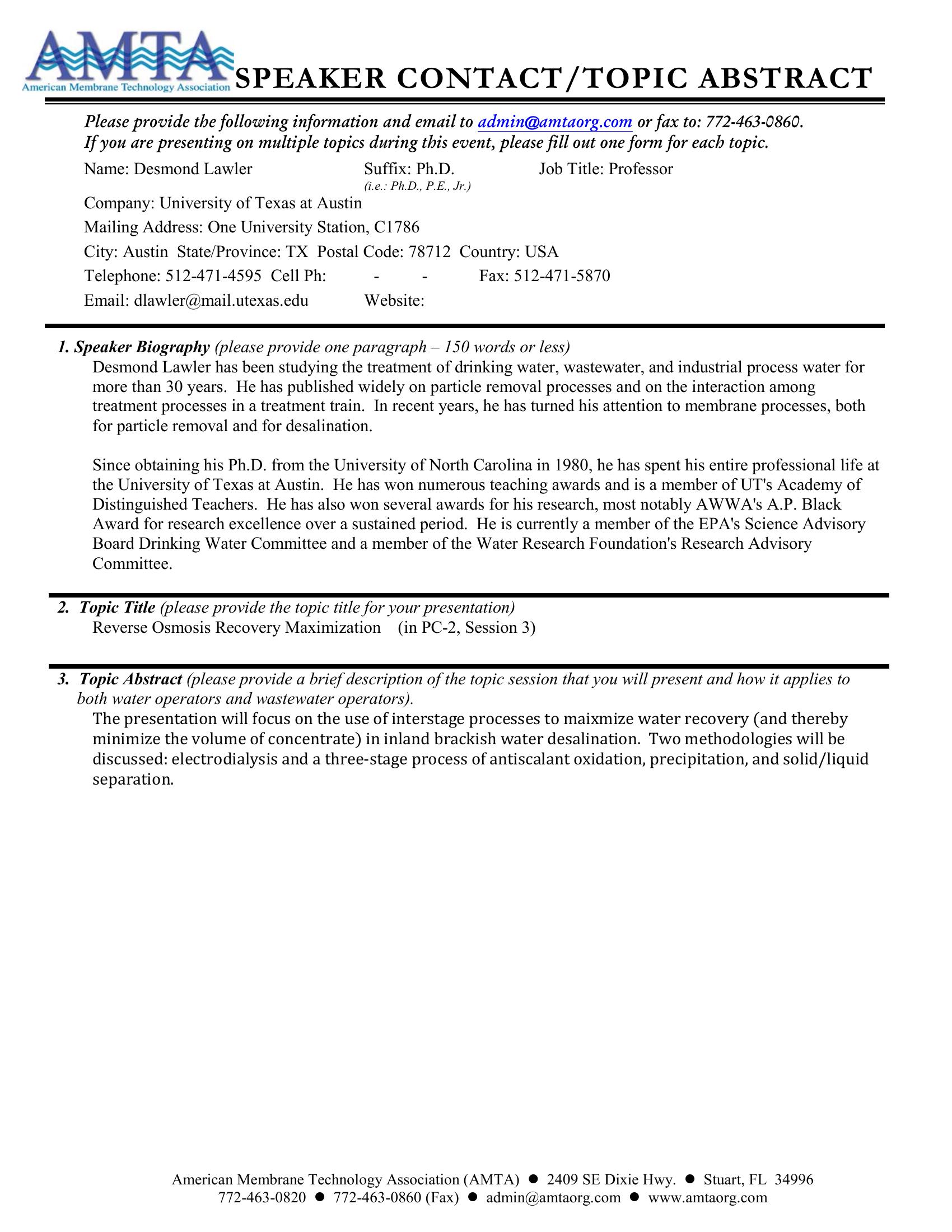 The presentation will focus on the use of interstage processes to maixmize water recovery (and thereby minimize the volume of concentrate) in inland brackish water desalination. Two methodologies will be