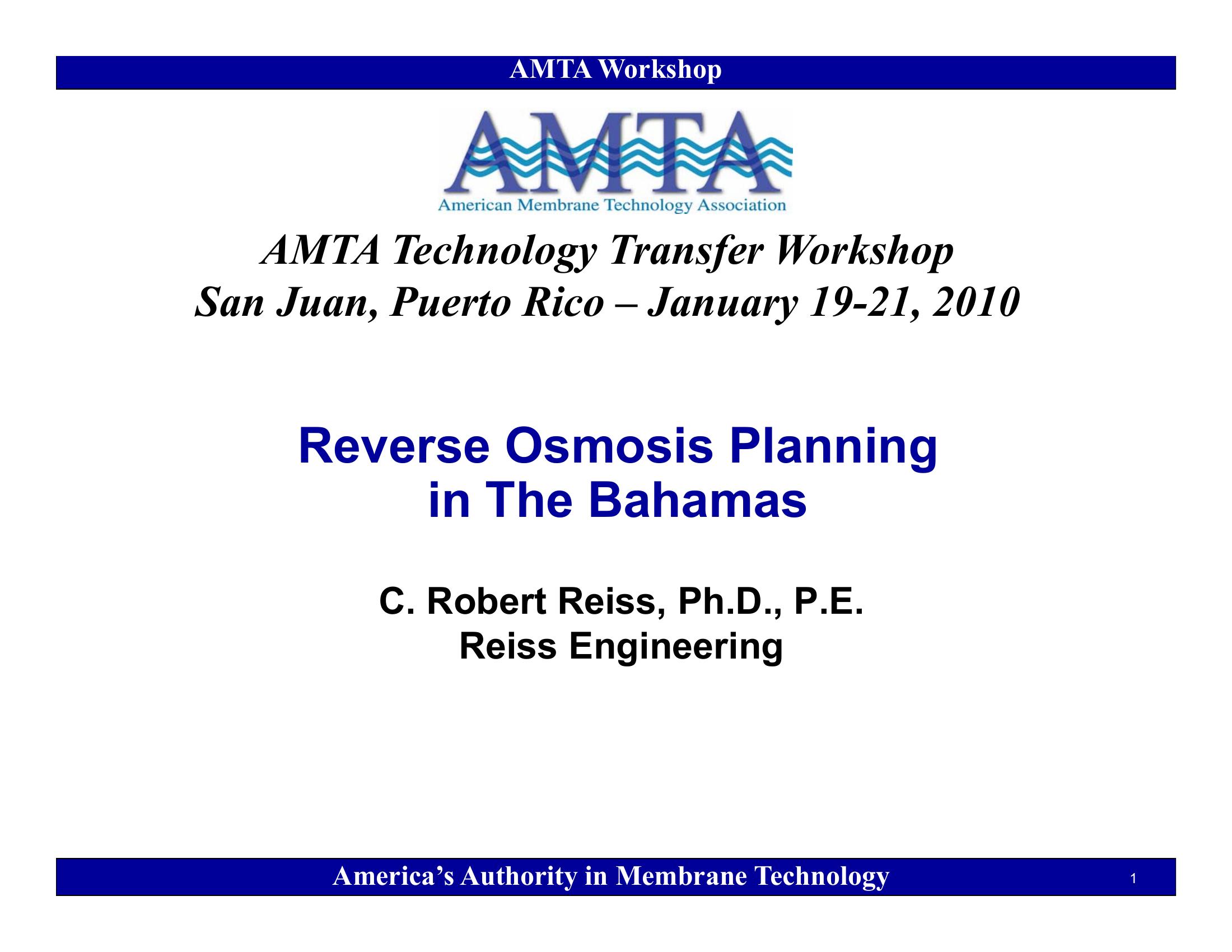 This powerpoint addresses water supply planning in the Bahamas and the use of reverse osmosis membrane technology, as part of a potable water franchise, to treat either brackish surface or groundwater or seawater.