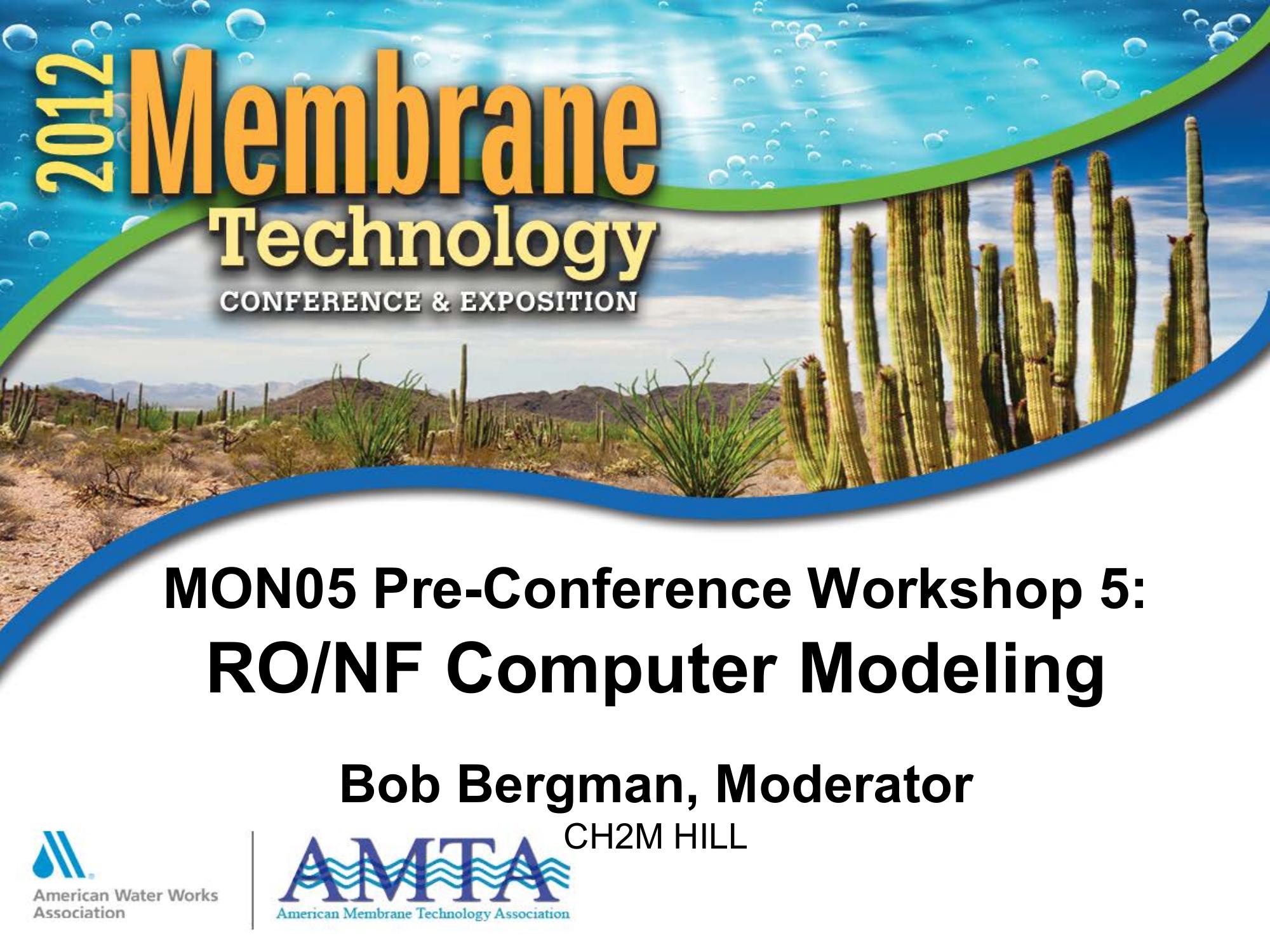 This presentation just provides a list of presenters for RO/NF Computer Modeling. The list (but no details) include Design Cases Seawater (surface water) RO; Brackish groundwater RO; Nanofiltration/membrane softening of well water; and Water reuse (Tertiary Treatment) with RO