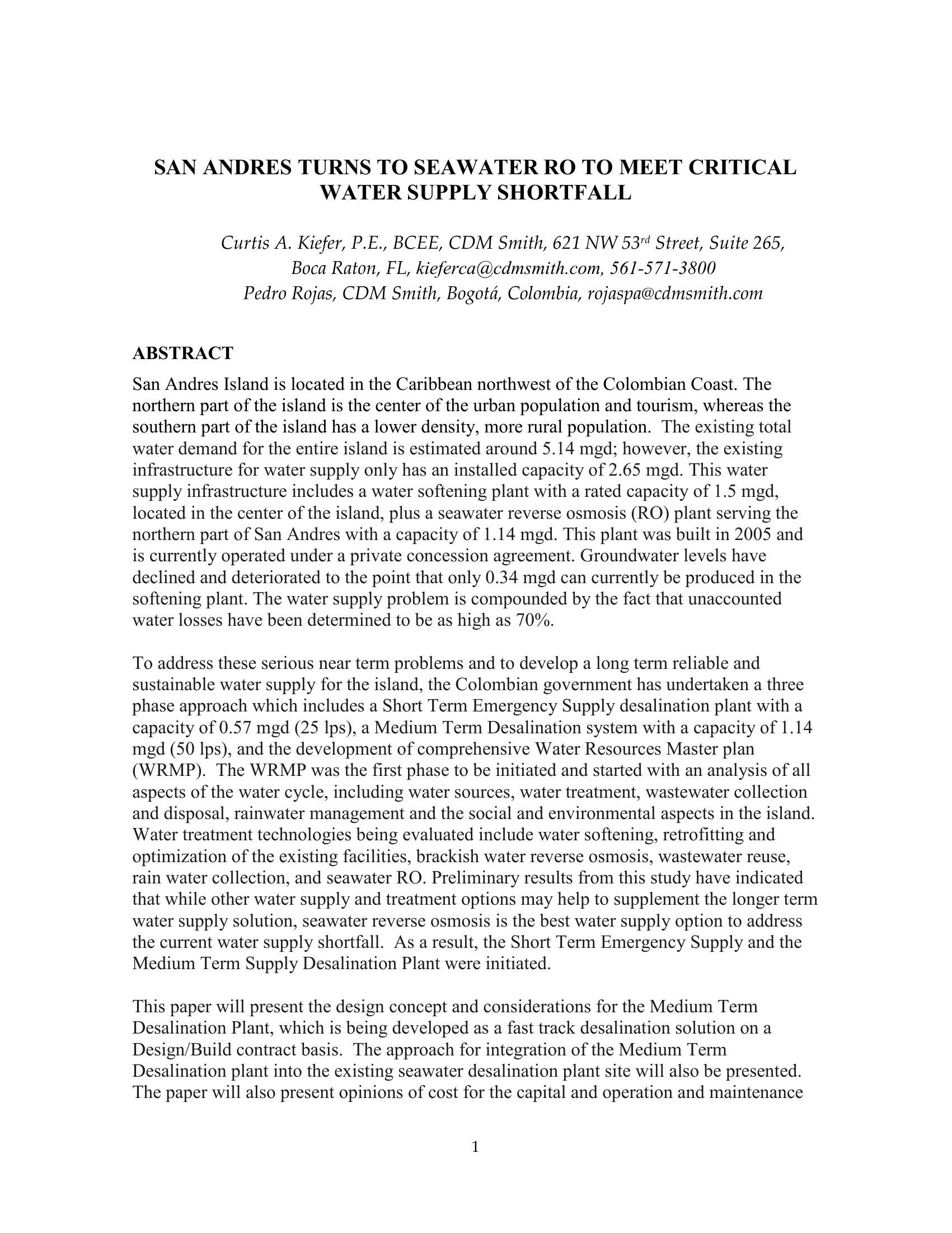 San Andres Island is located in the Caribbean northwest of the Colombian Coast. The northern part of the island is the center of the urban population and tourism, whereas the southern part of the island has a lower density, more rural population. The existing total water demand for the entire island is estimated around 5.14 mgd; however, the existing infrastructure for water supply only has an installed capacity of 2.65 mgd. This water supply infrastructure includes a water softening plant with a rated capacity of 1.5 mgd, located in the center of the island, plus a seawater reverse osmosis (RO) plant serving the northern part of San Andres with a capacity of 1.14 mgd. This plant was built in 2005 and is currently operated under a private concession agreement. Groundwater levels have declined and deteriorated to the point that only 0.34 mgd can currently be produced in the softening plant. The water supply problem is compounded by the fact that unaccounted water losses have been determined to be as high as 70%. To address these serious near term problems and to develop a long term reliable and sustainable water supply for the island, the Colombian government has undertaken a three phase approach which includes a Short Term Emergency Supply desalination plant with a capacity of 0.57 mgd (25 lps), a Medium Term Desalination system with a capacity of 1.14 mgd (50 lps), and the development of comprehensive Water Resources Master plan (WRMP). The WRMP was the first phase to be initiated and started with an analysis of all aspects of the water cycle, including water sources, water treatment, wastewater collection and disposal, rainwater management and the social and environmental aspects in the island. Water treatment technologies being evaluated include water softening, retrofitting and optimization of the existing facilities, brackish water reverse osmosis, wastewater reuse, rain water collection, and seawater RO. Preliminary results from this study have indicated that while other water supply and treatment options may help to supplement the longer term water supply solution, seawater reverse osmosis is the best water supply option to address the current water supply shortfall. As a result, the Short Term Emergency Supply and the Medium Term Supply Desalination Plant were initiated. This paper will present the design concept and considerations for the Medium Term Desalination Plant, which is being developed as a fast track desalination solution on a Design/Build contract basis. The approach for integration of the Medium Term Desalination plant into the existing seawater desalination plant site will also be presented. The paper will also present opinions of cost for the capital and operation and maintenance costs for the Medium Term Desalination Plant. While the existing seawater RO plant has been successful and generally provided a reliable supply of potable water, this paper will examine a number of improvements that are proposed for incorporation in the new facility including deeper supply wells for more consistent feed water supply and quality, greater spacing distance between the wells to reduce interaction between the wells, more redundancy of the pretreatment equipment for higher reliability, higher efficiency barometric energy recovery devices, membrane elements with reduced pressure loss, standby emergency diesel generator, improved product passivation, and better accessibility for equipment operation and maintenance.