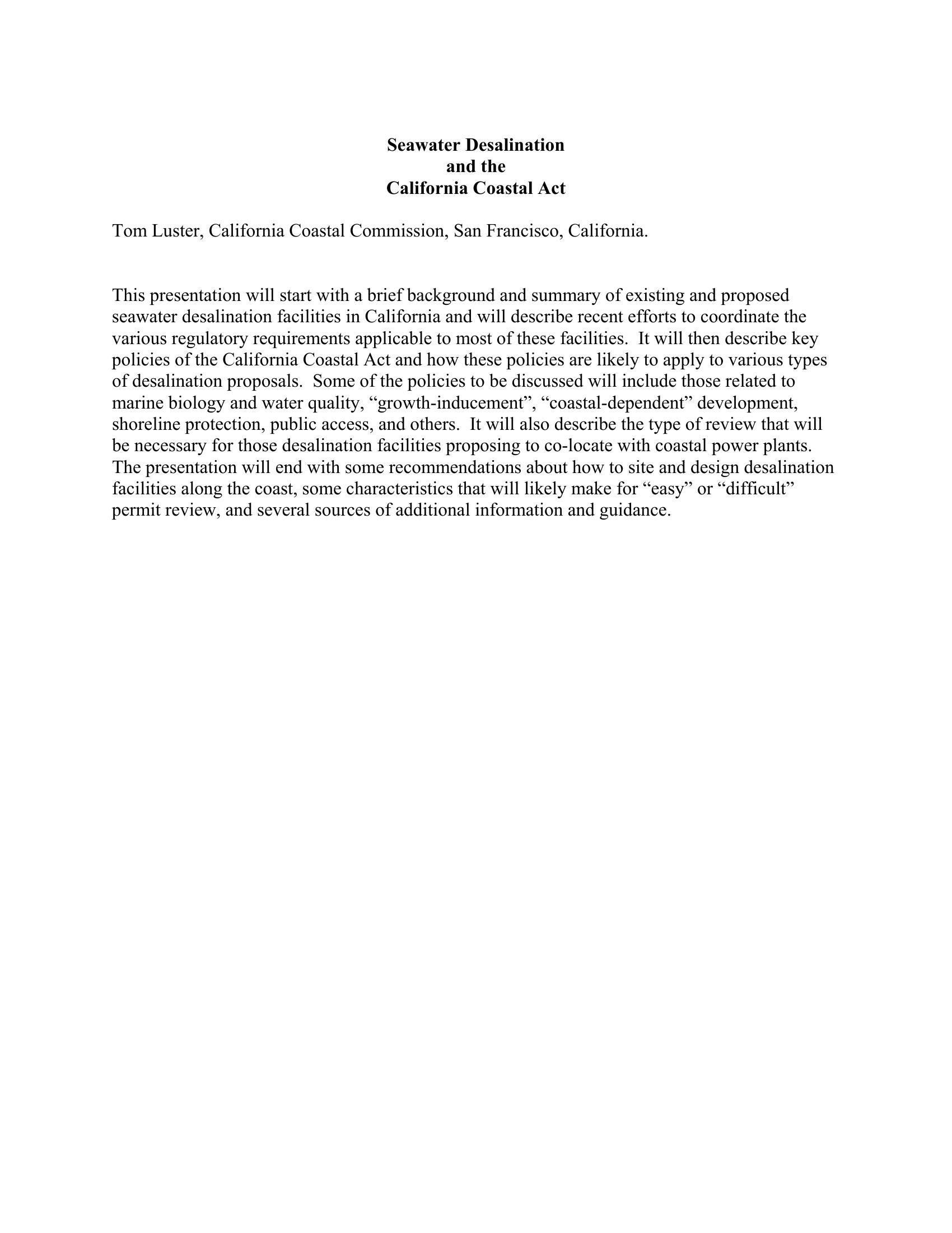 This presentation summarizes existing and proposed seawater desalination facilities in California and describing efforts to coordinate various regulatory requirements applicable to most of these facilities. It also describes policies of the California Coastal Act and how these policies are likely to apply to various types of desalination proposals.