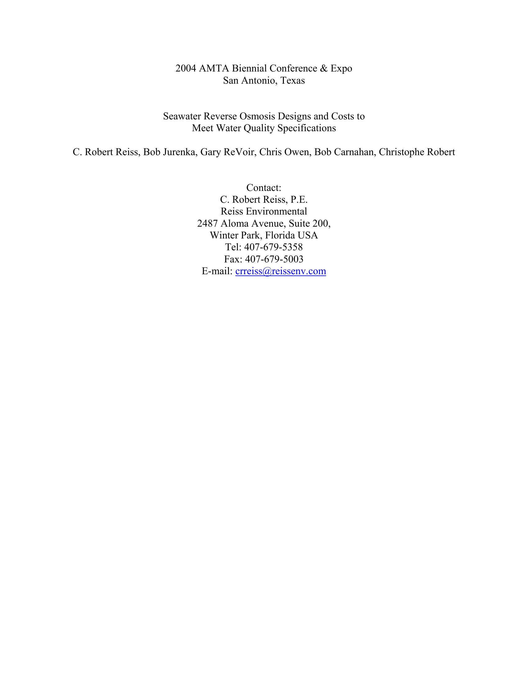 | Keywords | pilot testing, seawater desalination, Florida plants, membrane plant design |